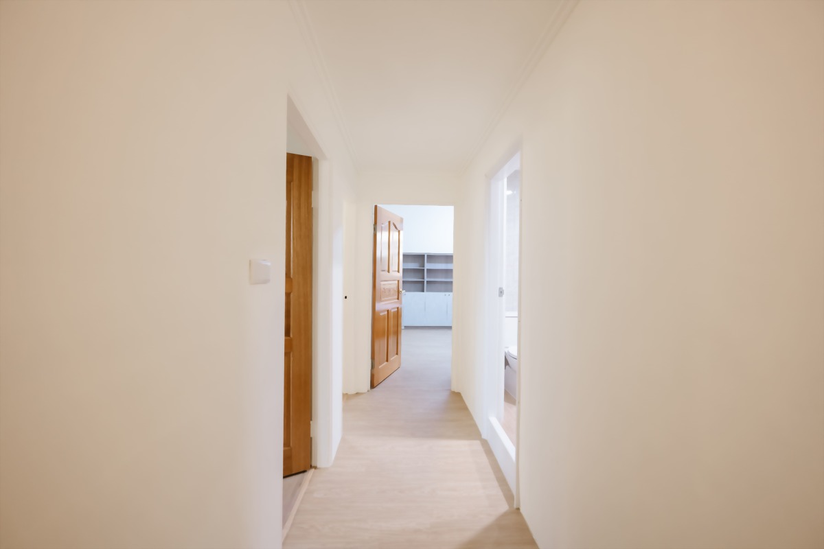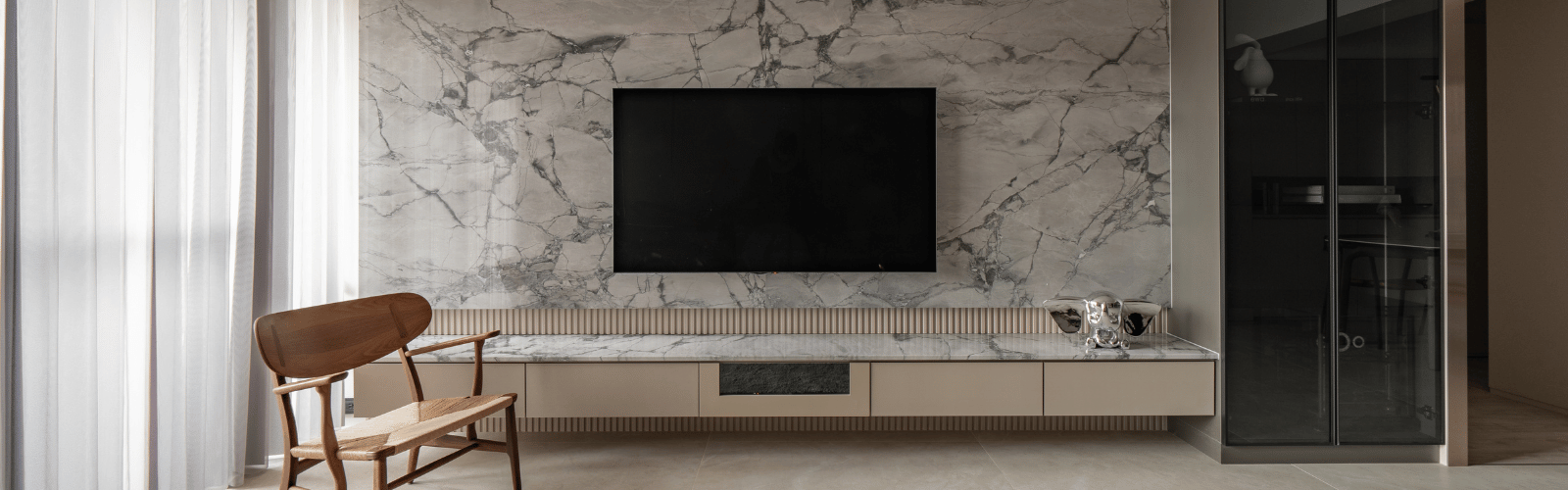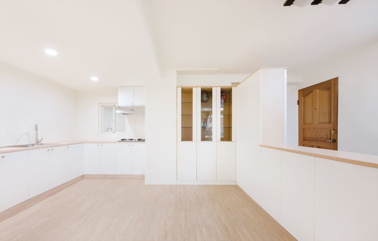 由於原本老式電視櫃也與現代大型電視的擺放較不搭,故拆除就電視櫃後仍保留客廳設計原有的樣貌,讓新屋主可以再依自己的需求及生活習慣添購合適的櫃體和設備。