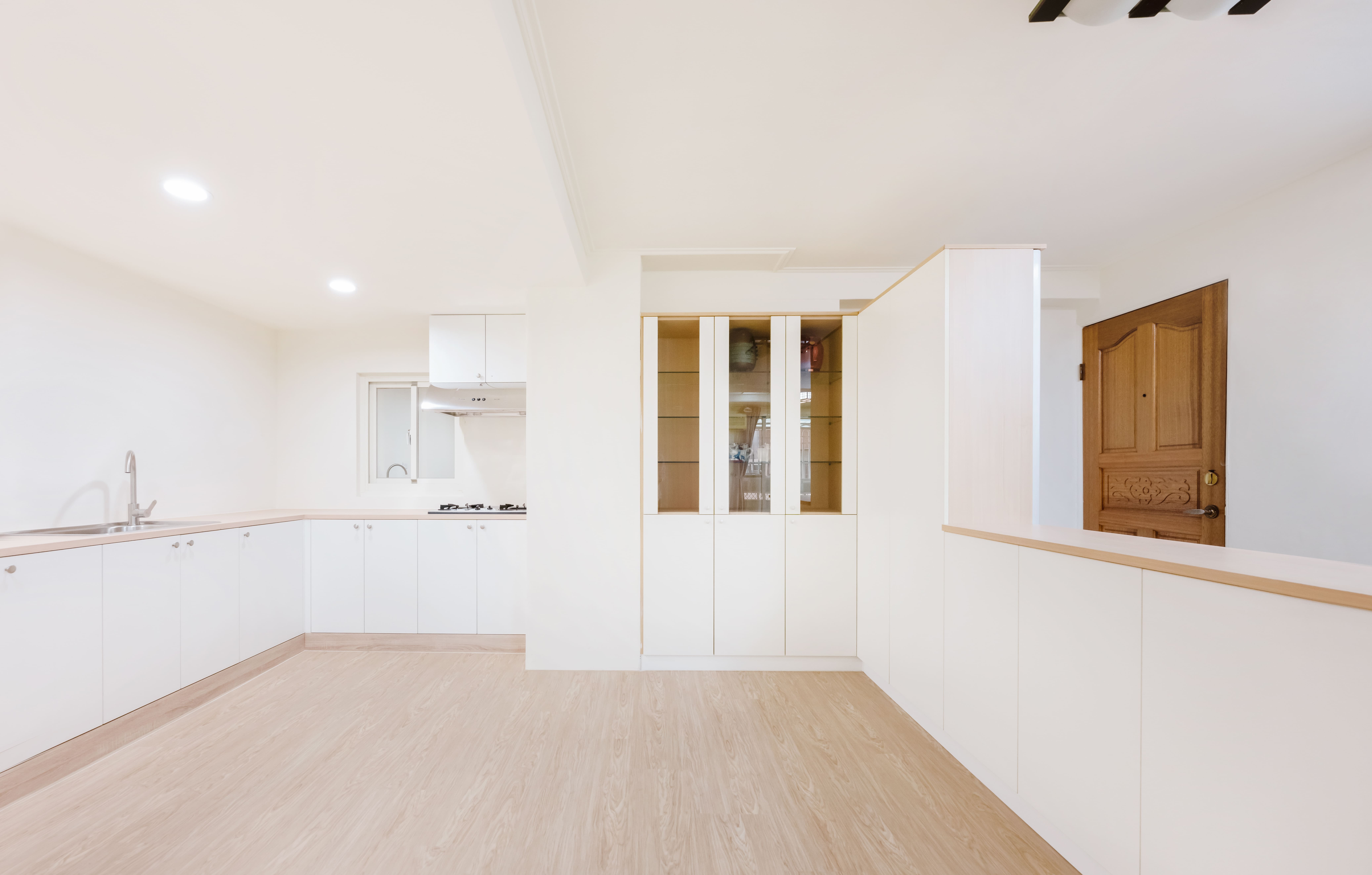 玄關設計保留原本的玄關櫃(餐廳櫃),區隔原本玄關處就能看到廚房的尷尬,也為屋主間接省下了一筆費用,還能達到設計機能、預算精簡、賣屋質感三者的平衡。