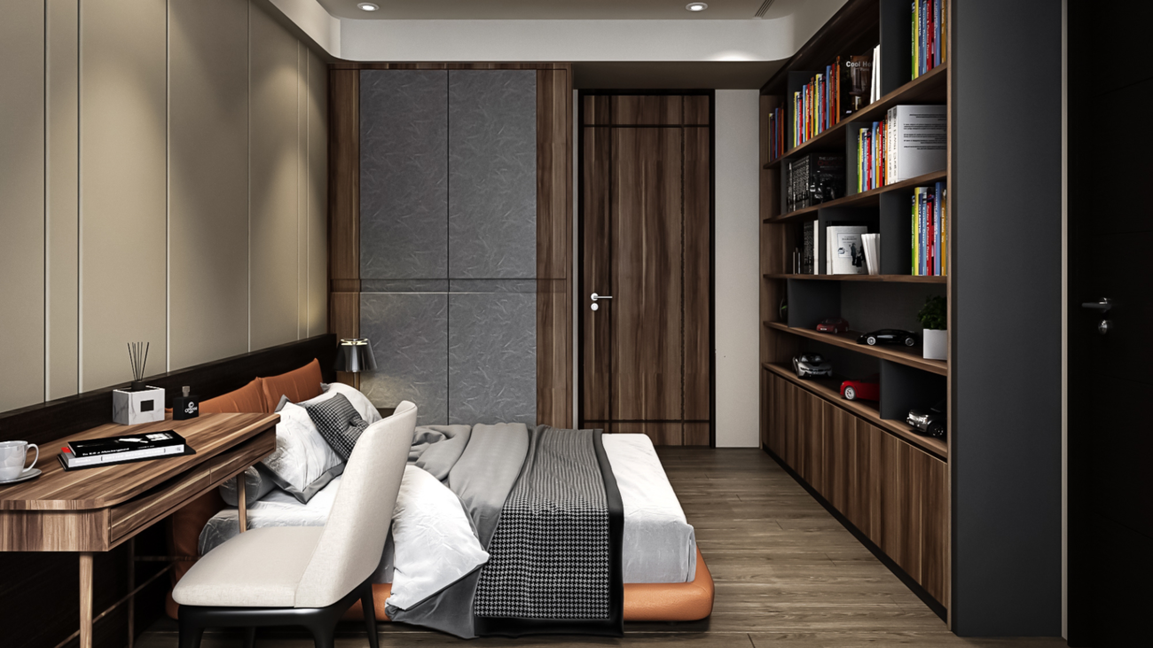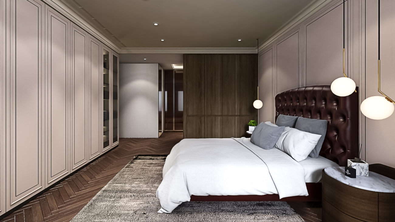 氣派大方的臥室空間設計,除了符合住家設計的一致性,也讓業主的寢居空間顯得相當寬敞舒適,空間設計上運用古典的元素結合現代感的線條,兩個不同的元素在空間設計內相互碰撞,結合出別有一番的室內設計風格,在裝潢設計上,將收納空間以精品系統櫃隱藏於牆面,不但美觀又有足夠的收納。