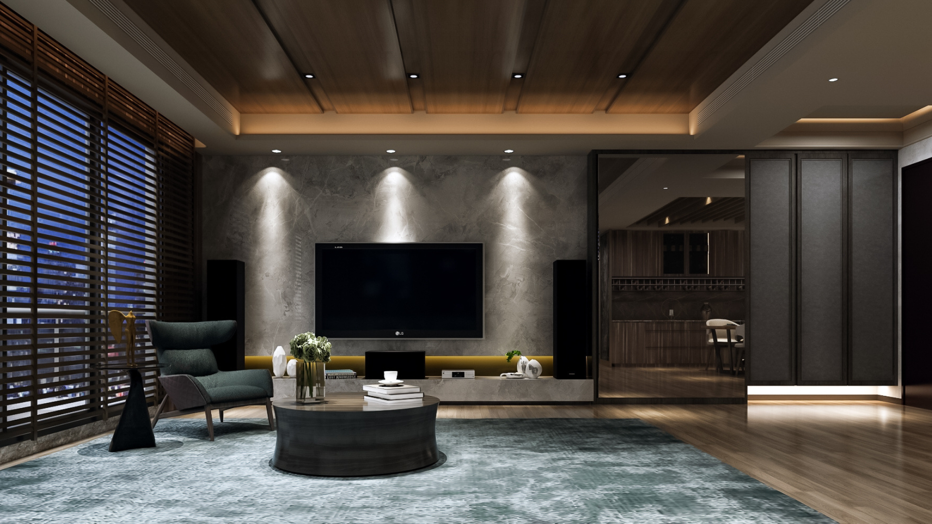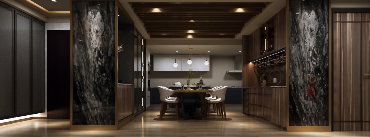 高貴而兼具知性之美的裝潢風格石材,肌理宛如水波盪漾;深沉高級原木色木皮材質,與時尚奢華的金屬邊框裝潢結合,展現室內空間設計的內斂沉靜、明澈清新而又氣勢磅礡,線條勾勒精緻細膩的空間風格生活情境。