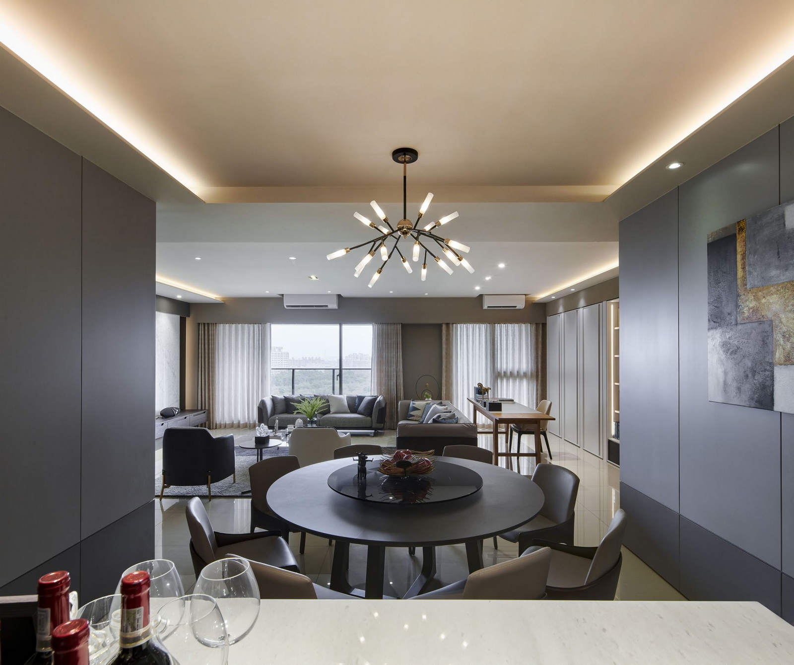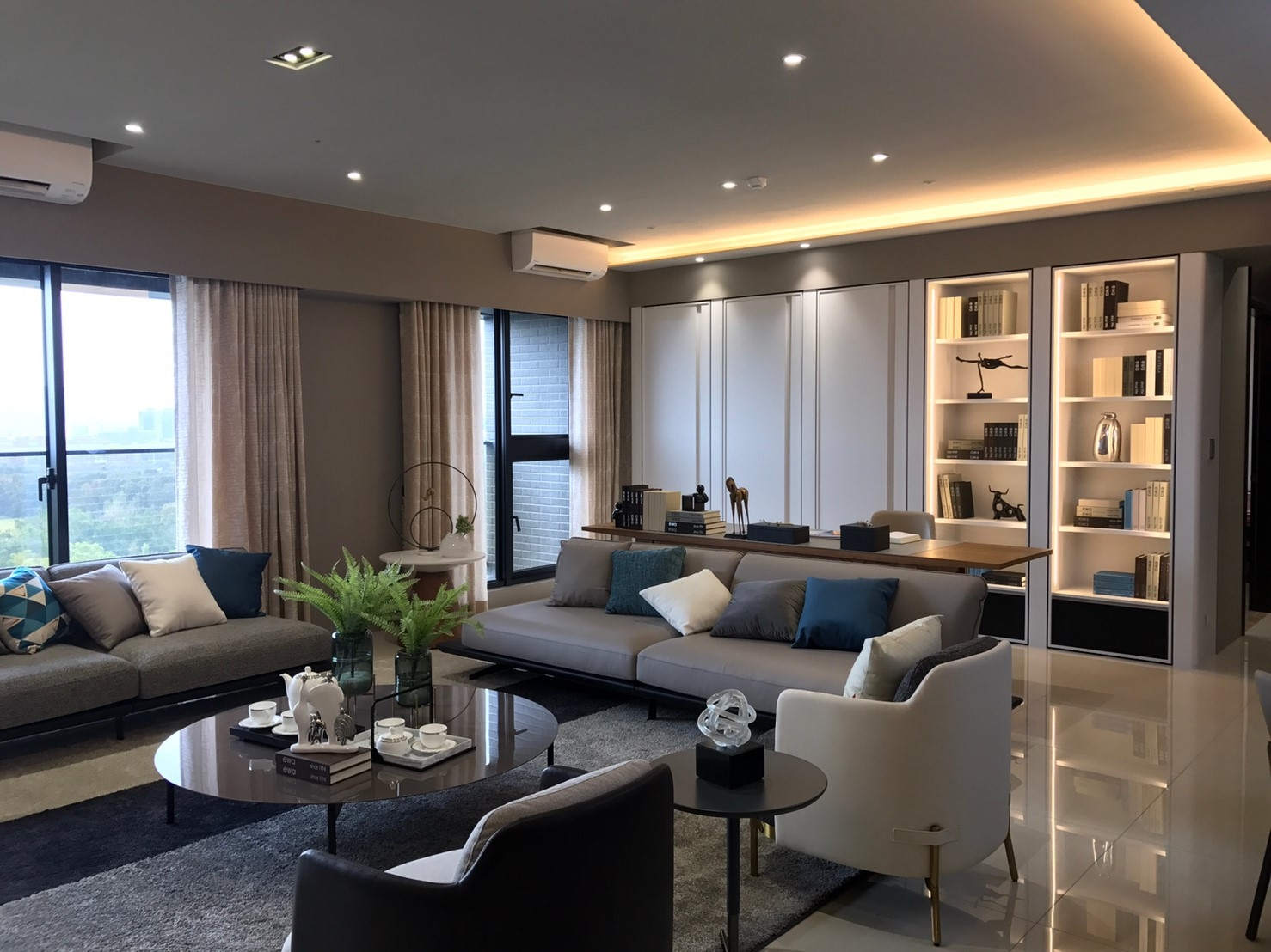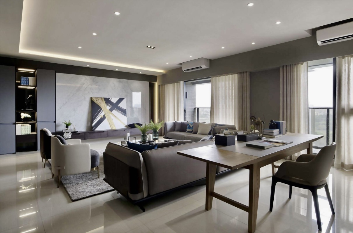 公領域天花板在室內裝潢設計中加入間接照明,以俐落的框架成就開放尺度,創造光線、視覺在空間設計上的流動,並藉由灰色、白、深木色等溫煦沈穩的色彩運用,搭配雅致軟裝家具、系統傢俱系統櫃,讓居宅充滿獨有的俐落風格。