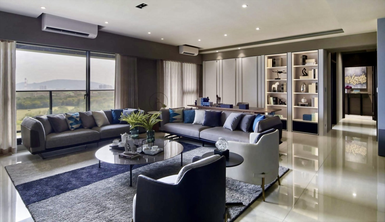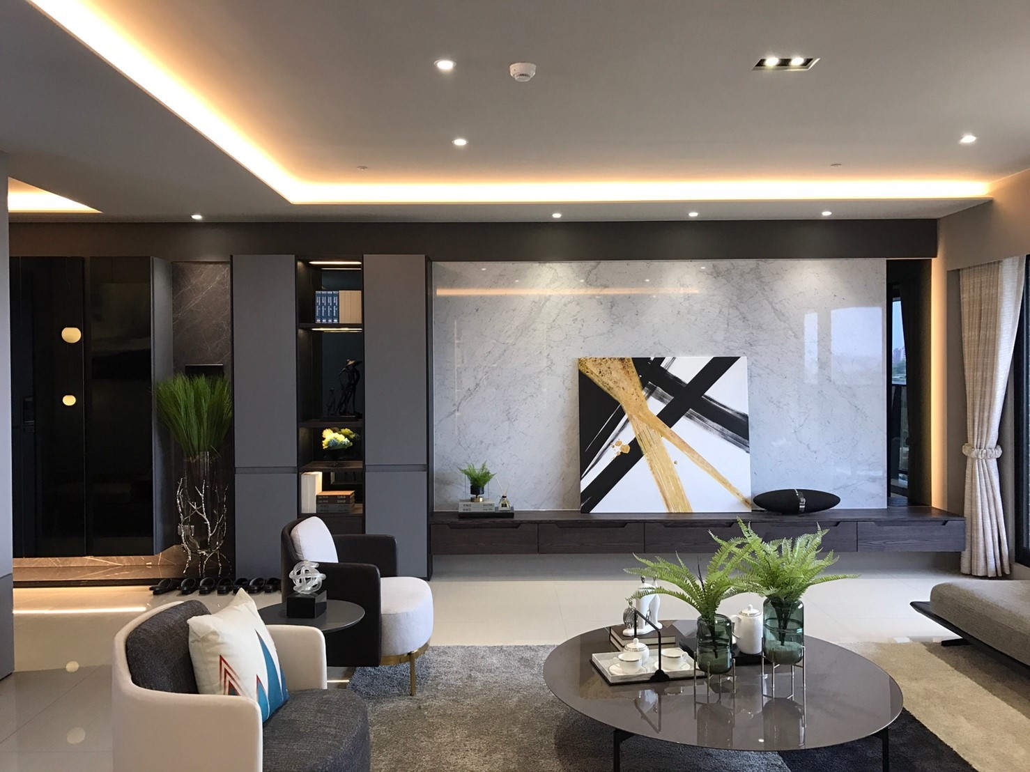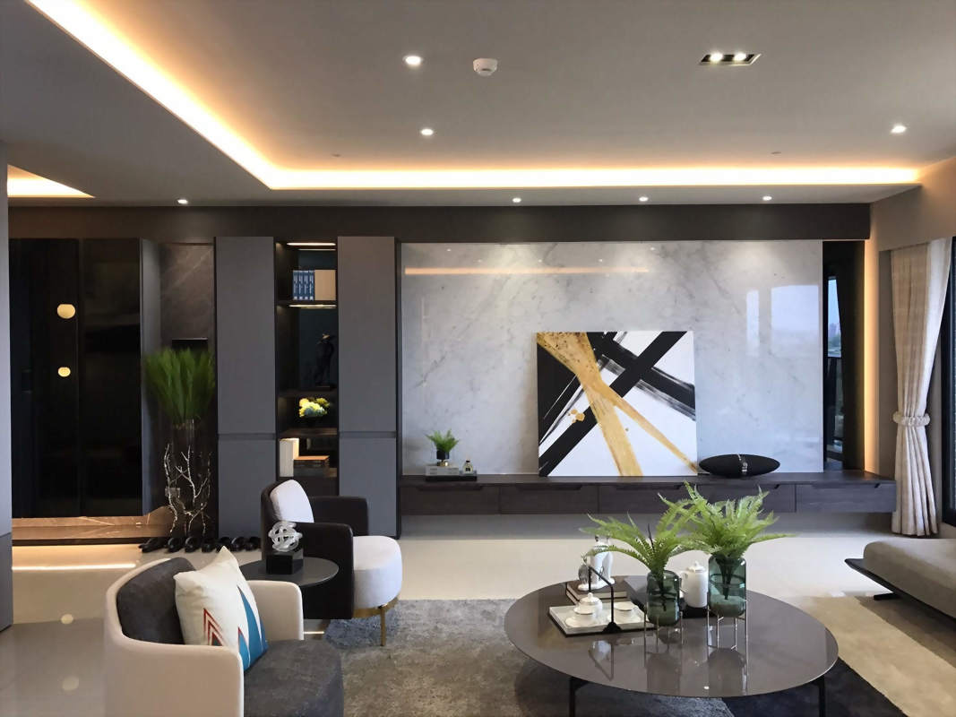 公領域天花板在室內裝潢設計中加入間接照明,以俐落的框架成就開放尺度,創造光線、視覺在空間設計上的流動,並藉由灰色、白、深木色等溫煦沈穩的色彩運用,搭配雅致軟裝家具、系統傢俱系統櫃,讓居宅充滿獨有的俐落風格。