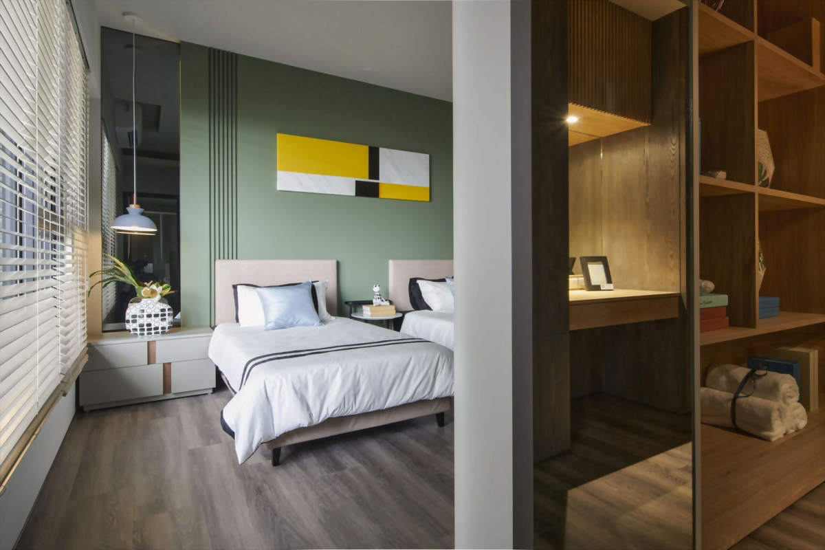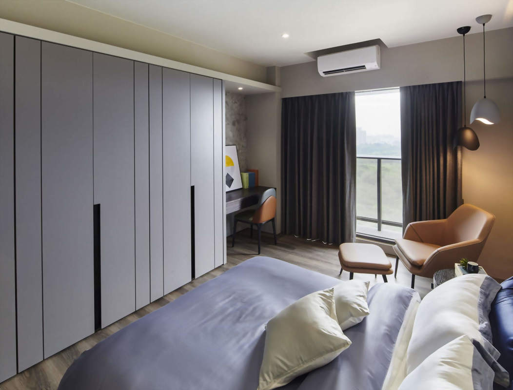 裝潢風格感強烈的臥室,讓人馬上留下一個相當有質感的室內設計印象,透過深藍色及木紋地板的裝潢室內設計打造一個北歐風的室內設計基底,燈具選用暖黃色,讓深藍跟暖黃呈現一個輕奢的裝潢設計呼應色,搭配家具選用,讓整個空間設計的裝潢風格更顯得完整。
