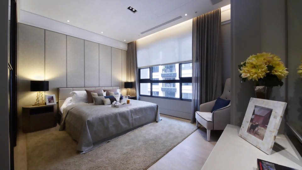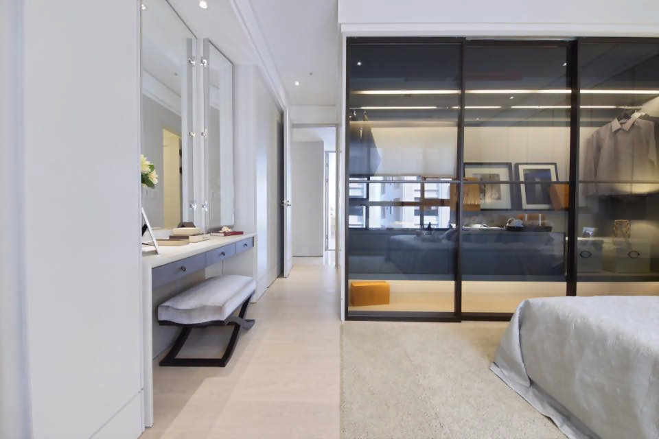在寢居空間設計上,運用大量會讓人感受到穩重舒適的顏色作為空間設計基調,搭配著燈具所映照出來的光線及大面採光充足的自然光,讓整間臥室空間設計多了朝氣,其中將臥室的一部分以透明玻璃拉門隔出更衣室空間,讓臥室的空間有一個區域上的分隔,結合精品系統櫃,透光性玻璃的拉門讓空間不會被阻斷,仍然在視覺上有一定的寬敞感及延伸性。