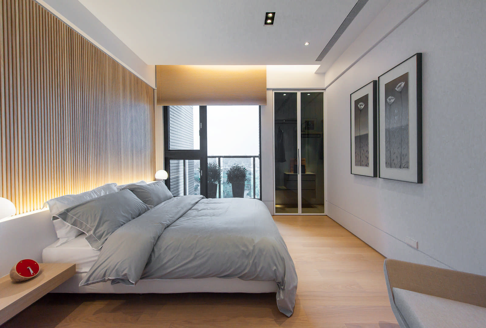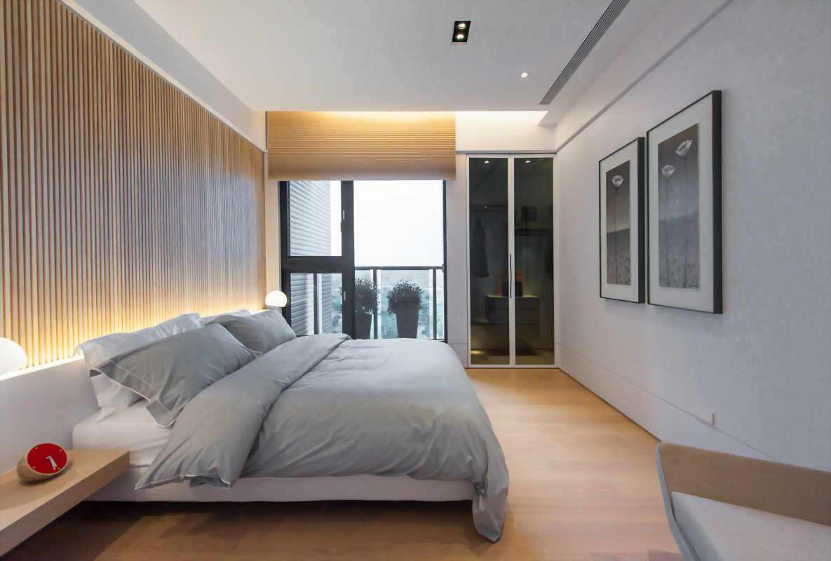 白牆面與淺灰床單,搭配大量木質元素,加上床頭簡約設計燈飾,讓臥室空間給人紓壓的生活感受。