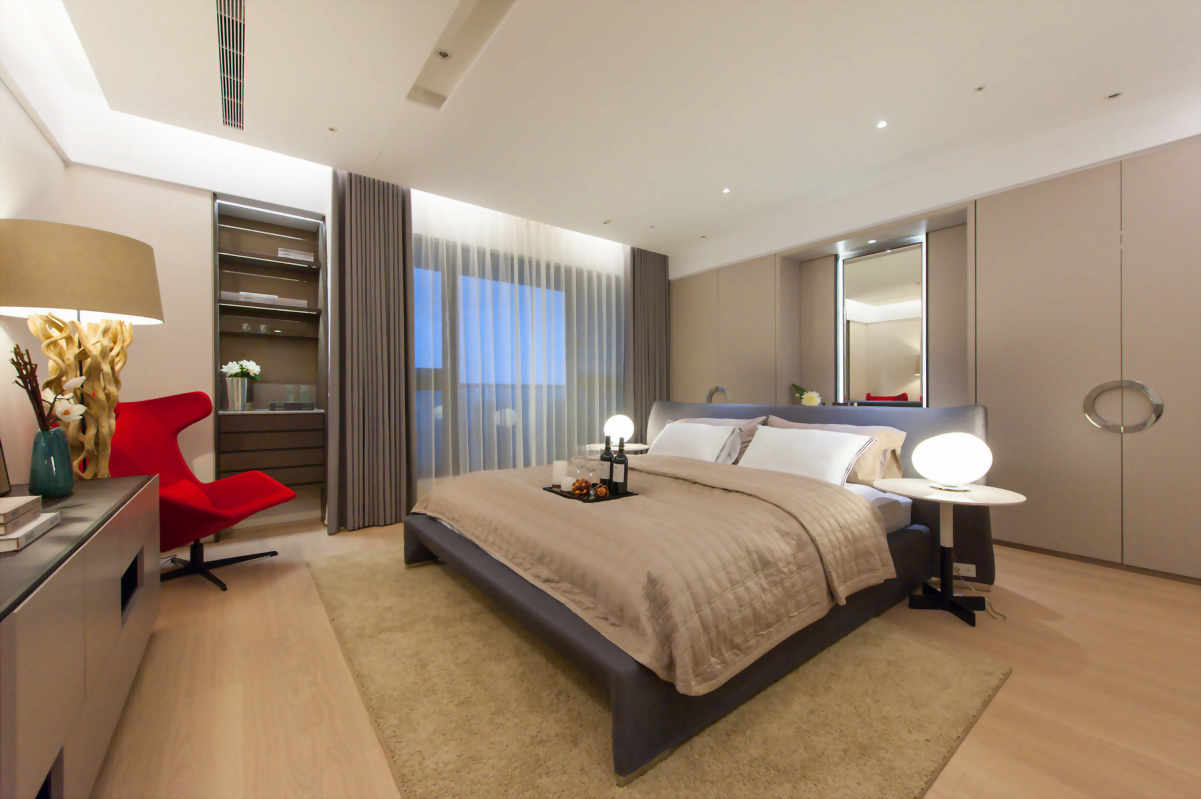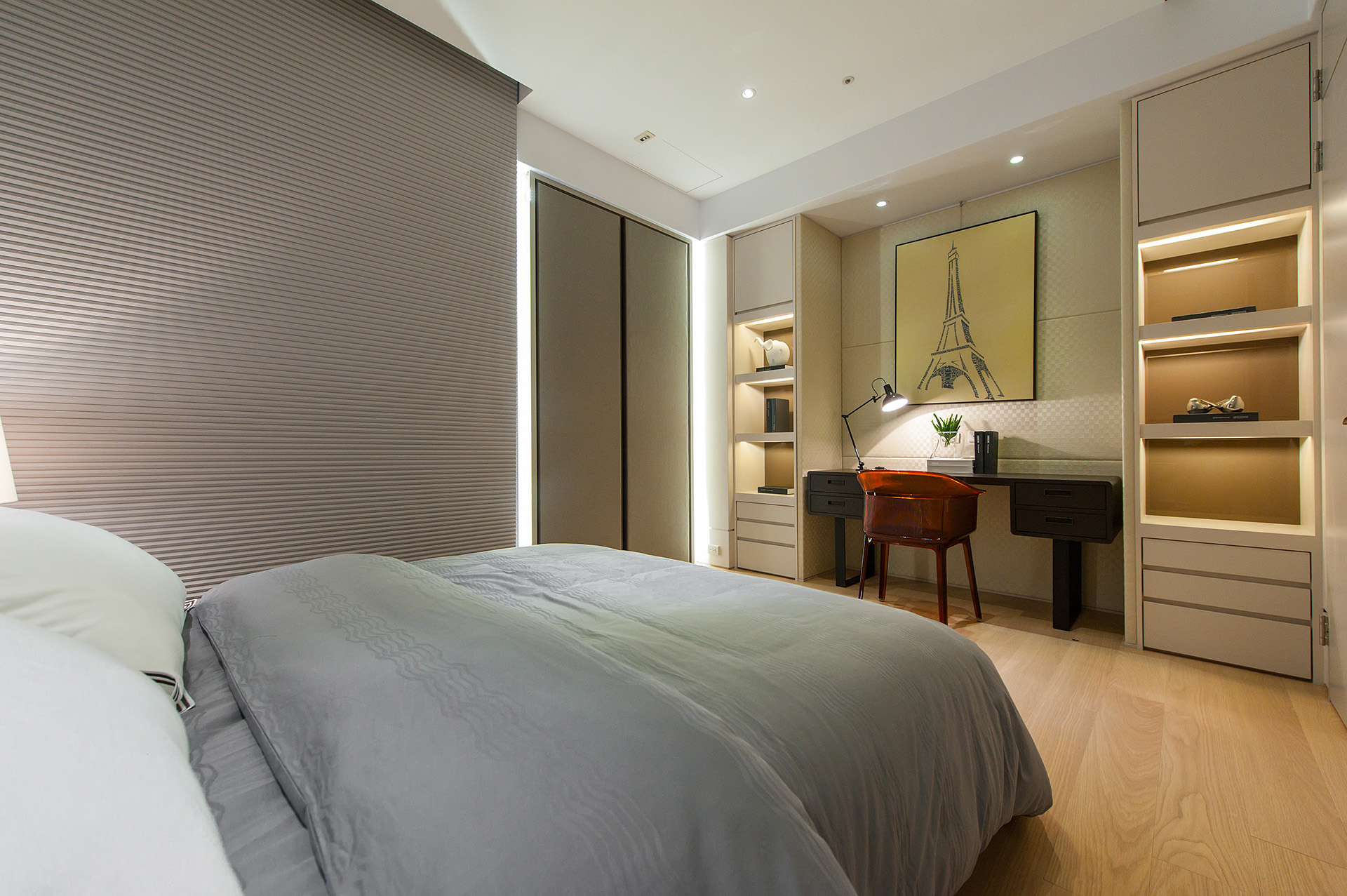 在裝潢設計上加了灰色窗簾與床單的灰相互呼應,讓空間設計單純卻不優雅失品味。