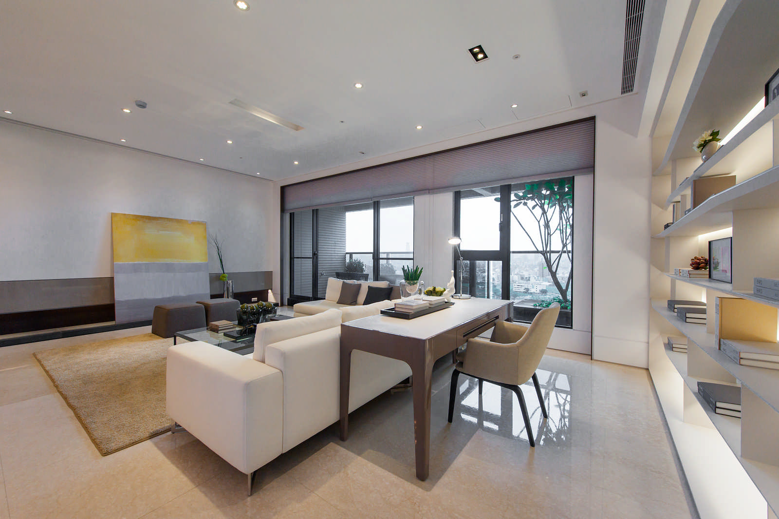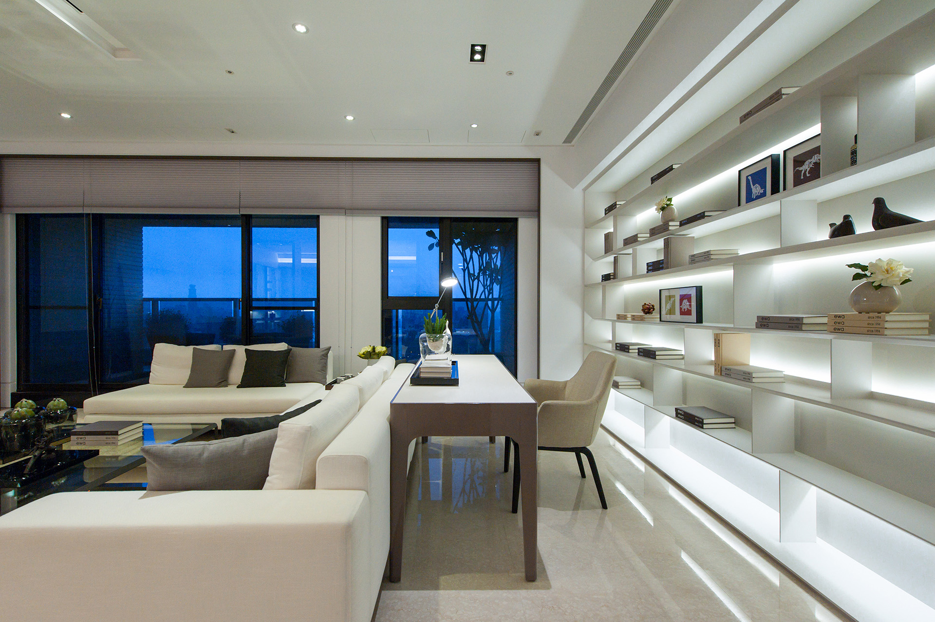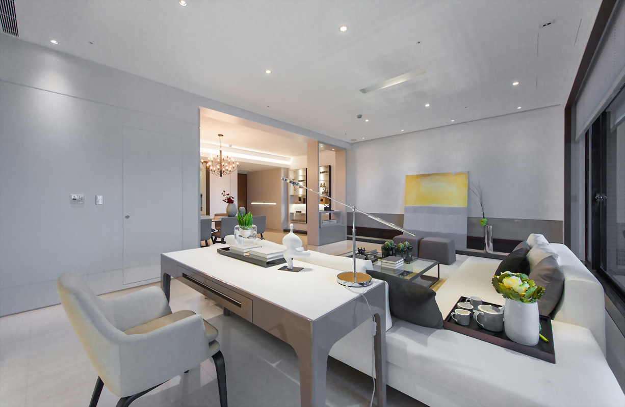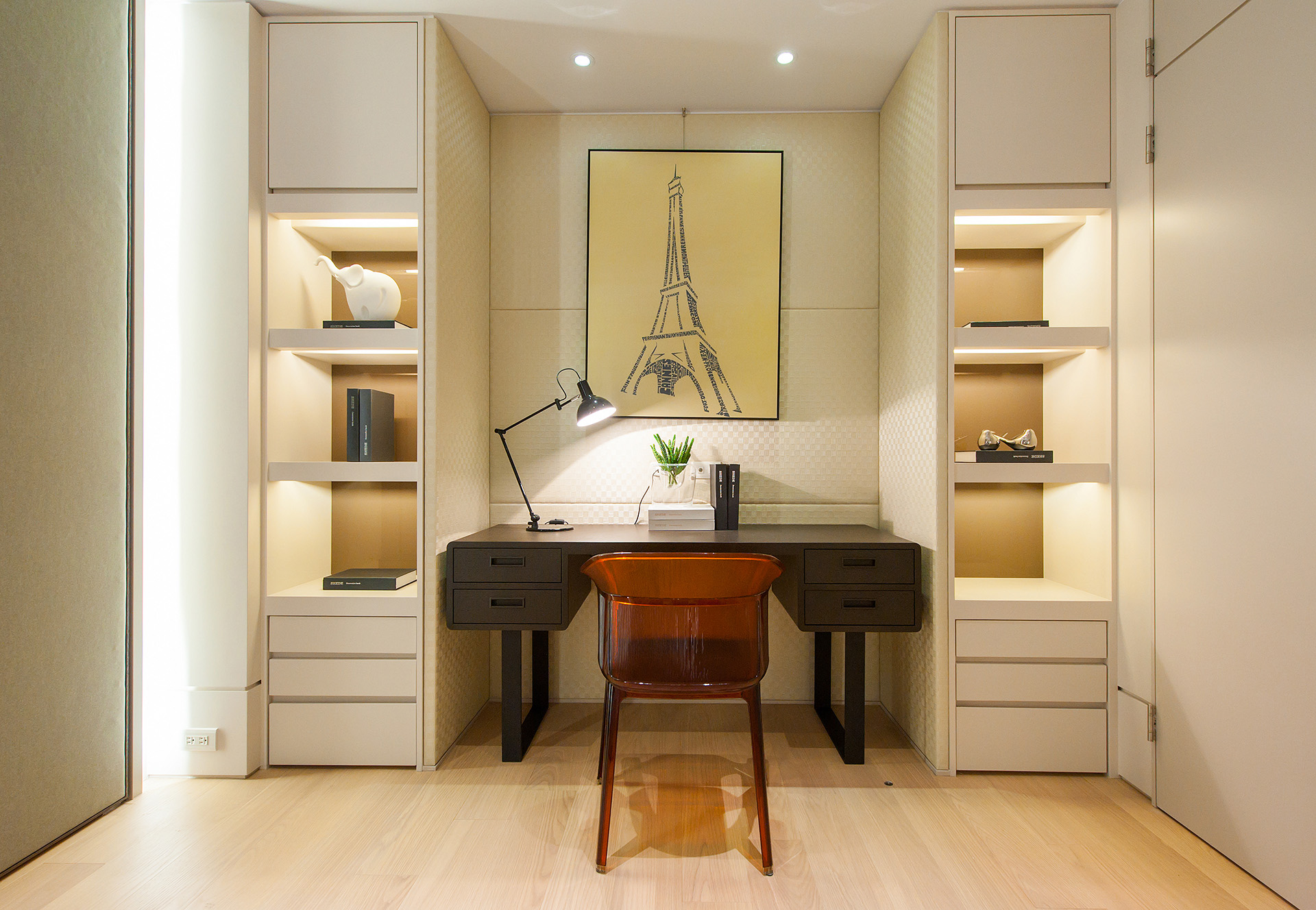客廳裡,特別空間設計規劃一處為開放式工作空間,透光感的陳列櫃裝潢設計,讓簡潔的空間多了些設計感,增添空間設計的視覺感受。