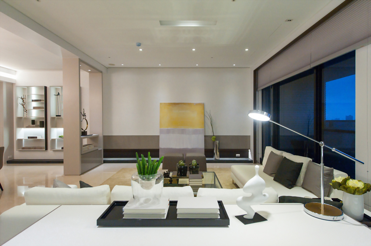 白色沙發、亮黃色畫作、簡單的綠色植栽、深淺色抱枕,讓裝潢設計以淺白色系為主基調,減少複雜、厚實的軟裝傢俱,燈光以鑲嵌的方式,讓視覺空間設計更舒適寬敞。