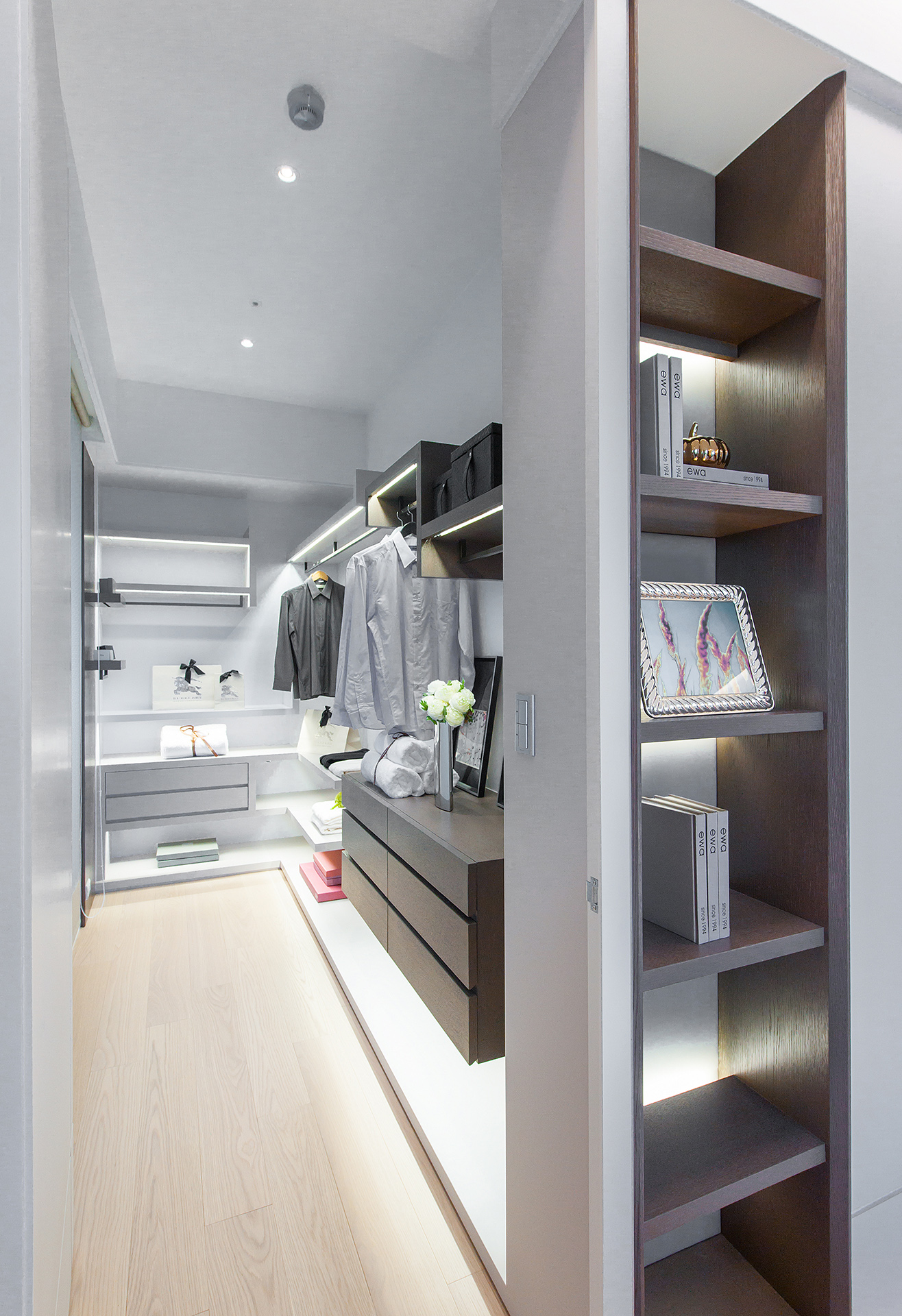 傳統印象中,更衣間往往光線不夠,又容易凌亂,捨棄深色系的室內空間裝潢配色規畫,以白色與搭配深棕的色彩配置,融入居家整體風格的室內設計中,局部光的設計方式,讓更衣間更為便利,整體設計上也更為優雅俐落。