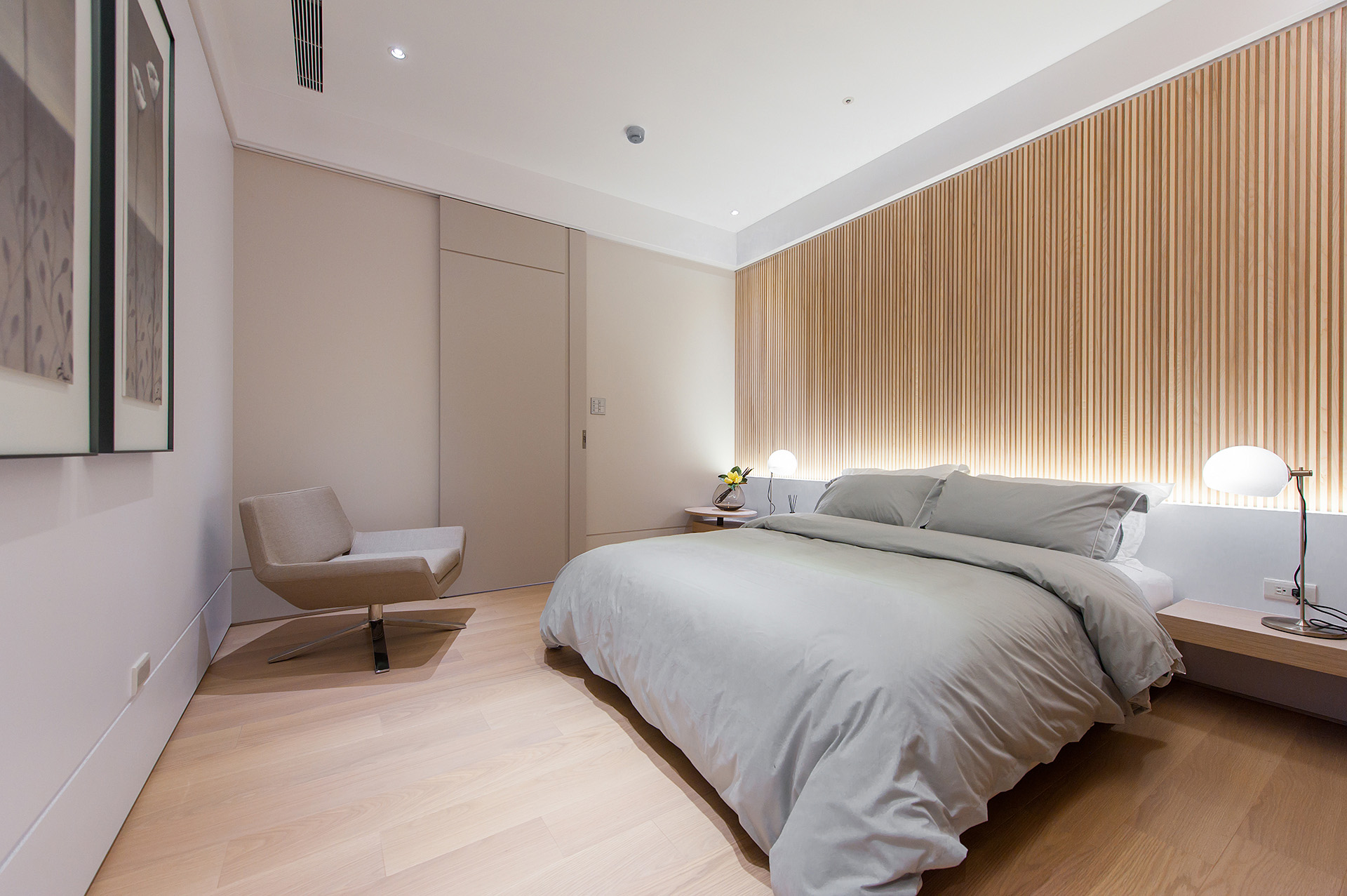 以木線板材的牆面刻意營造住家設計更為自然、舒適的臥室空間。