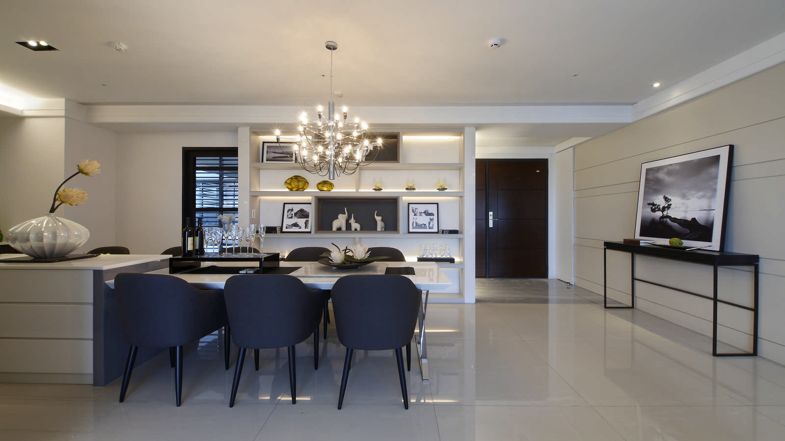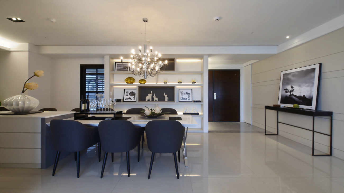餐廳空間通常會是三五好友聚餐的地方,為了不要隔擋空間,所以餐廚空間結合,因此餐廳的方便性及機能性就顯得相當重要。