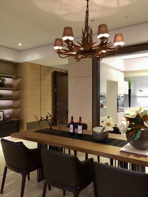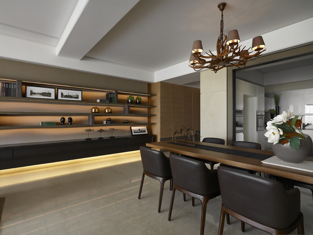 白色的沙發,提升了整體空間室內設計的明亮感;而深棕色木質餐廳桌椅,則讓整體空間因為木質特有的溫潤裝潢風格,豐富了餐廳空間設計的氛圍。