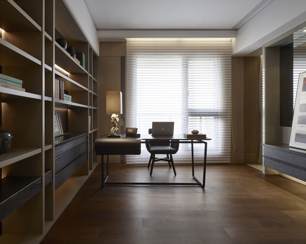 運用半透明深色玻璃,搭配整體室內設計大地色系與沉穩的風格,讓書房的設計空間多了沉靜的氛圍,更適合沉澱、思考、閱讀。