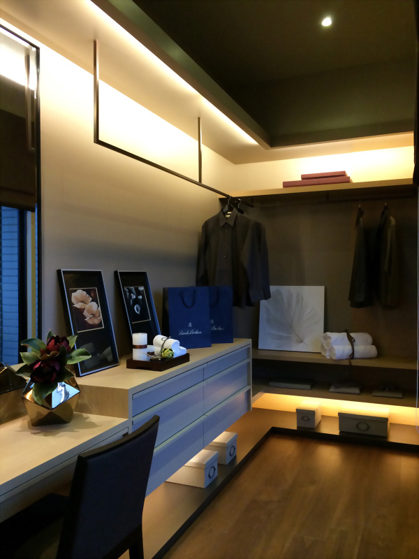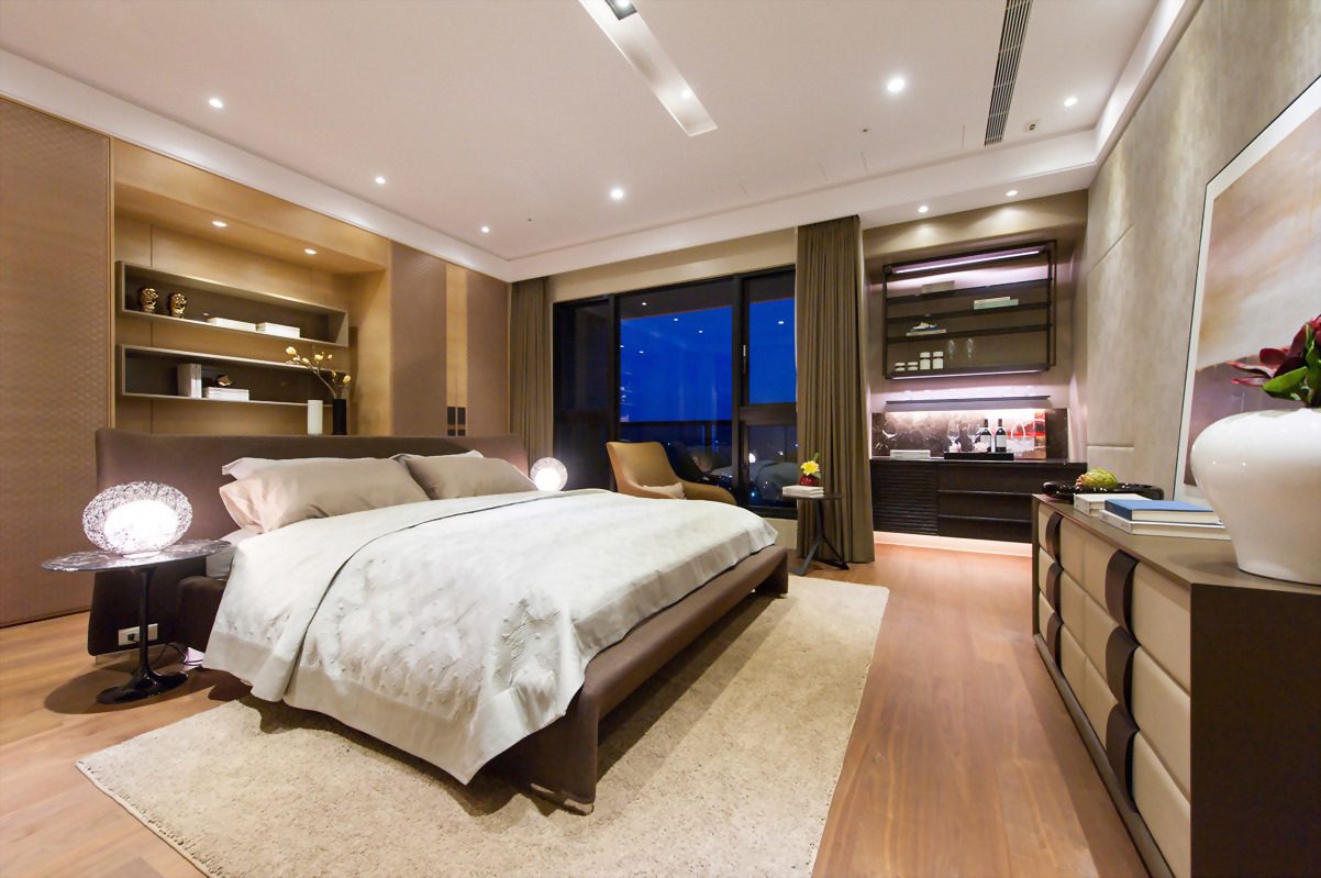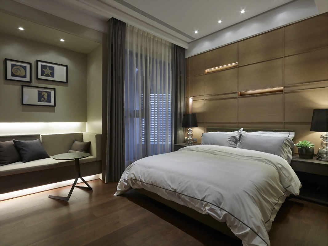 同樣以局部光床頭設計營造臥室氛圍,但不同於一般小型臥室,由於主臥室有較為寬敞的空間設計運用,所以在室內空間設計規劃上也須考量動線與預留空間的安排。
