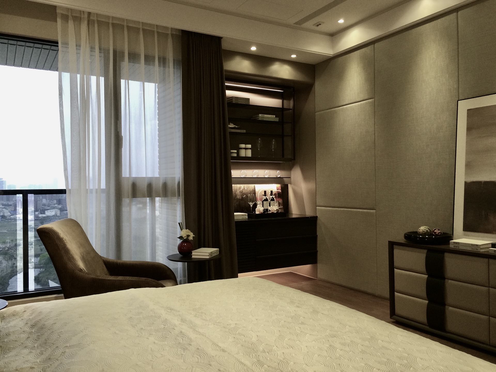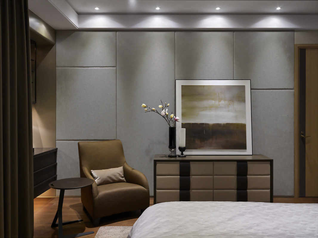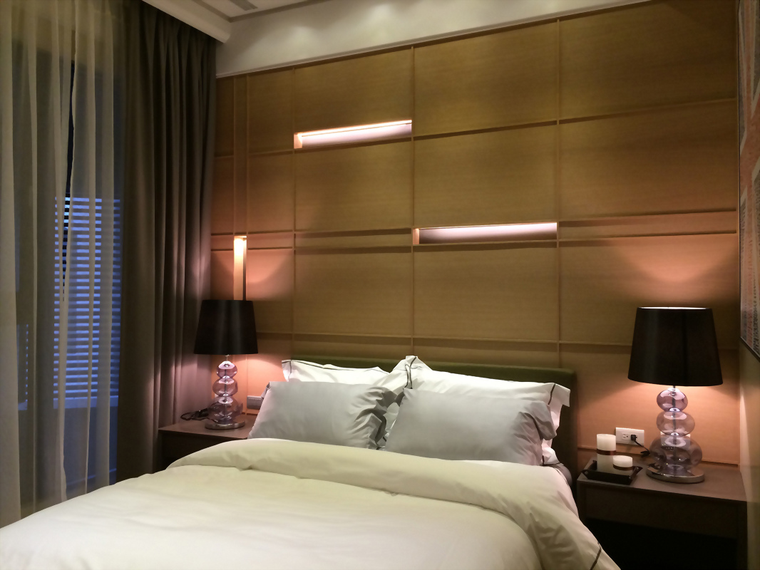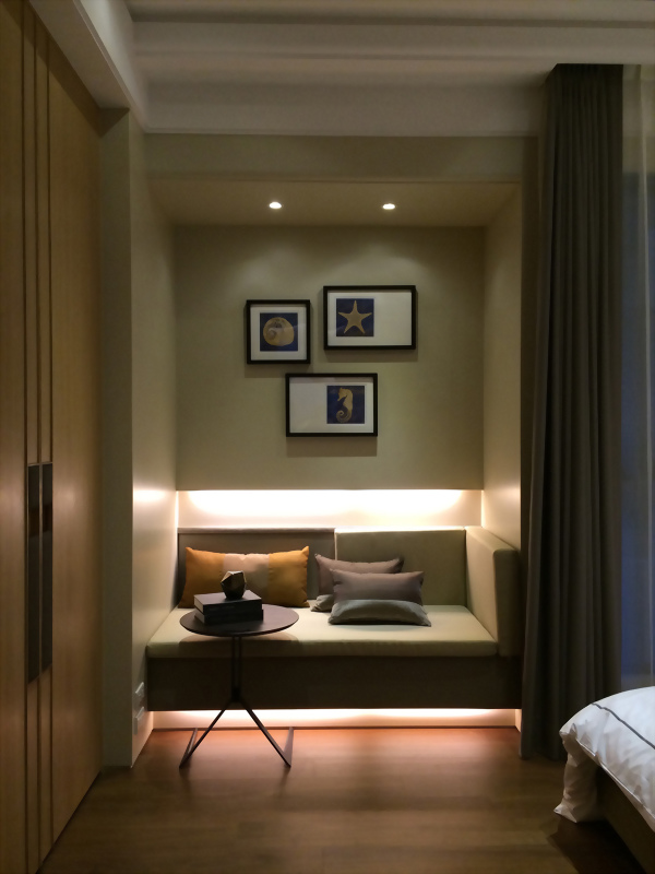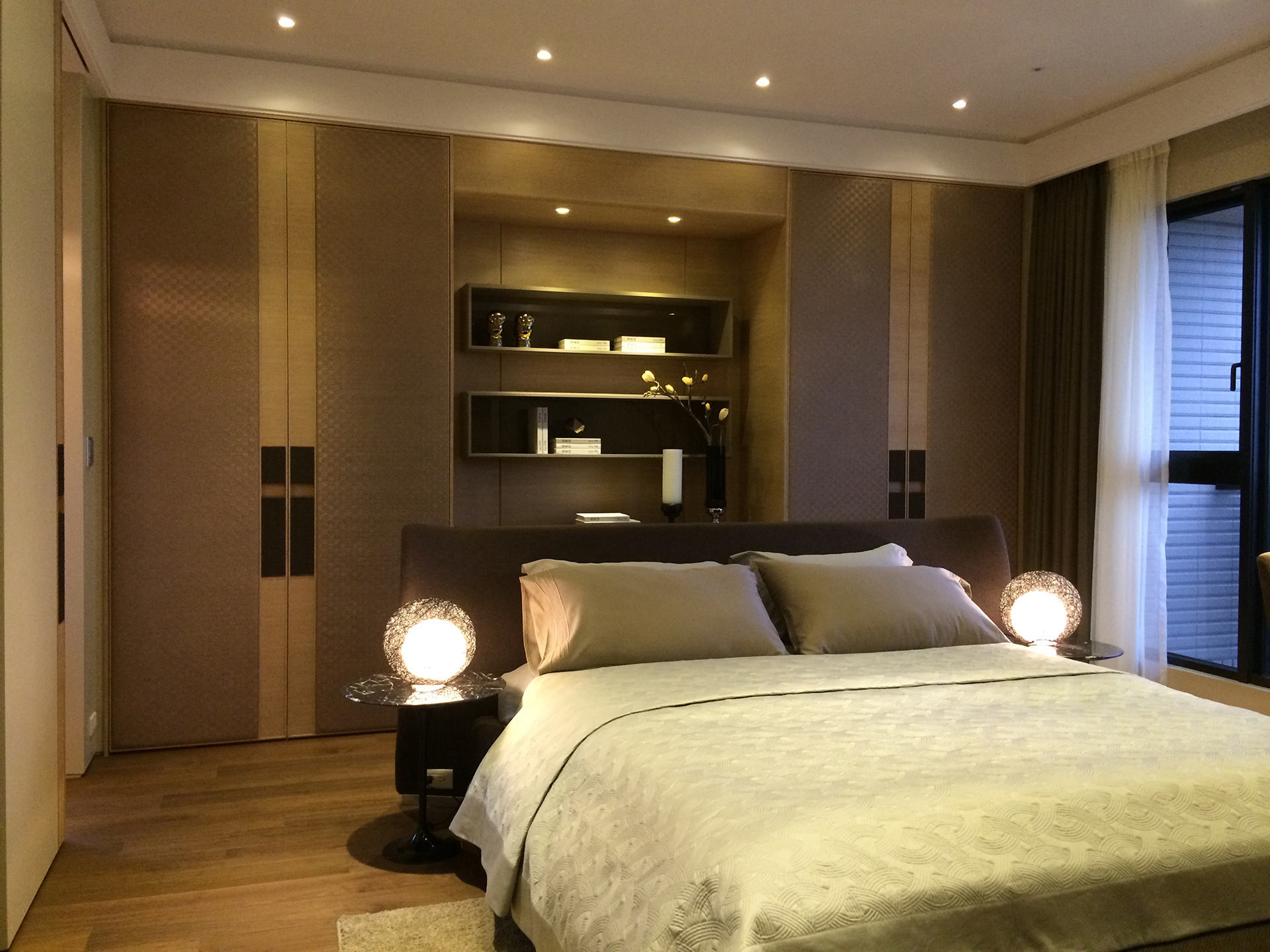 在臥室設計時,大量使用局部光來營造空間設計舒適柔和的臥房空間,在室內設計規劃上以木作訂製床頭設計,牆上特意規劃內崁式裝潢設計局部光設計,再搭配床頭兩旁造型檯燈,創造小臥房式適合睡眠的舒壓氣氛。