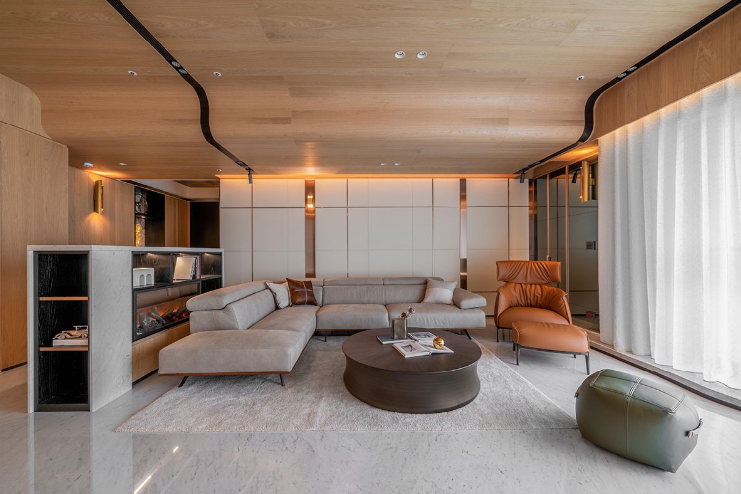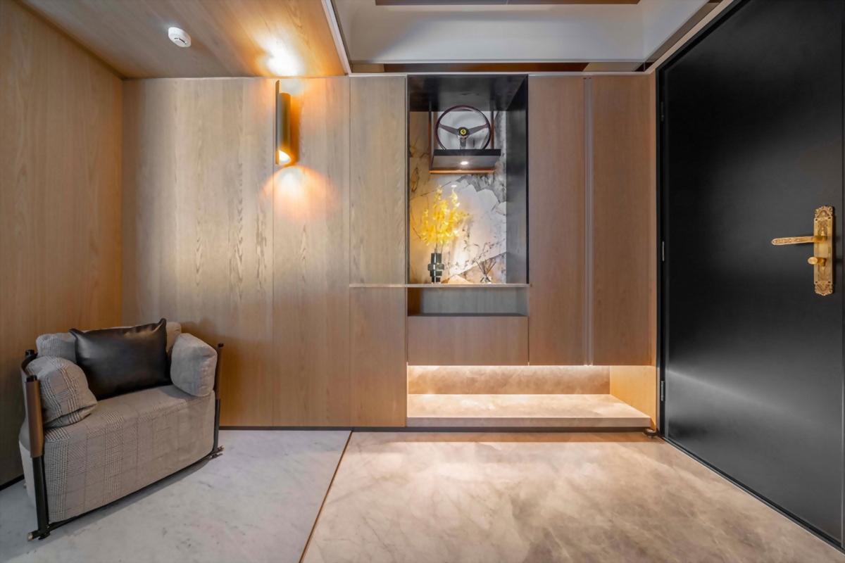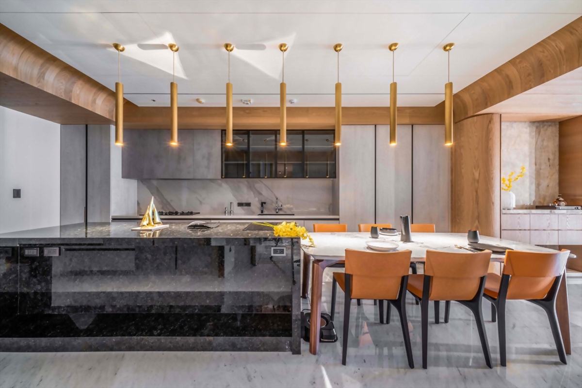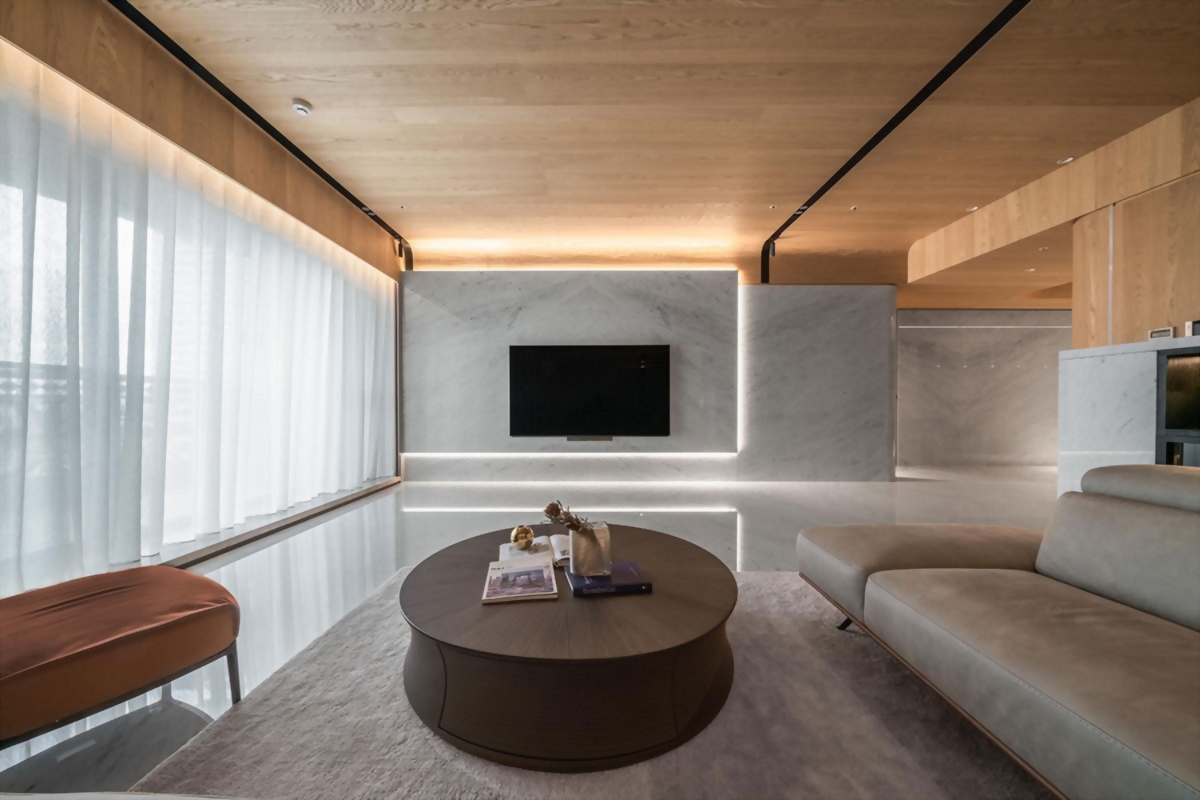 融合木質的溫潤與石材的穩重,搭配間接光源的引導,營造安定而柔和的氛圍。自然紋理成為空間的語言,光影流動則訴說著家的呼吸。綠建材的導入不僅為健康把關,也回應永續的生活態度。