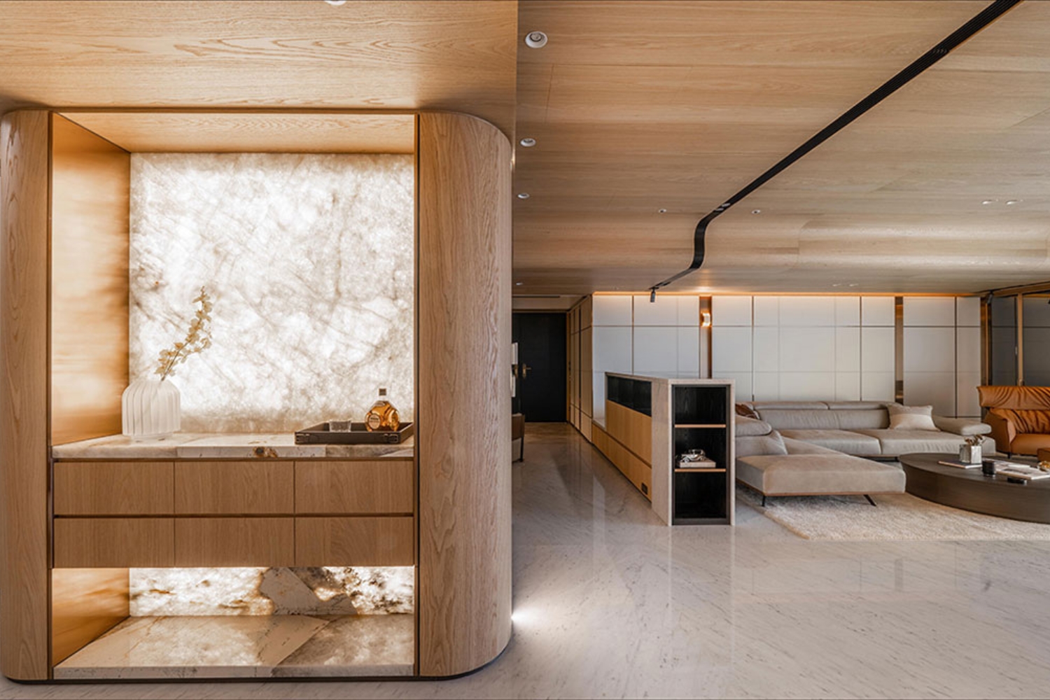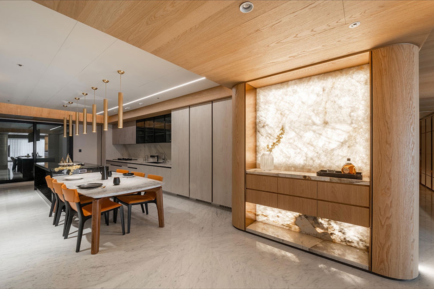 主要選材:大理石、天然木皮、鍍鈦件、天然皮革、奢石、大板磚、特殊漆、壁爐、海島型手刮木地板