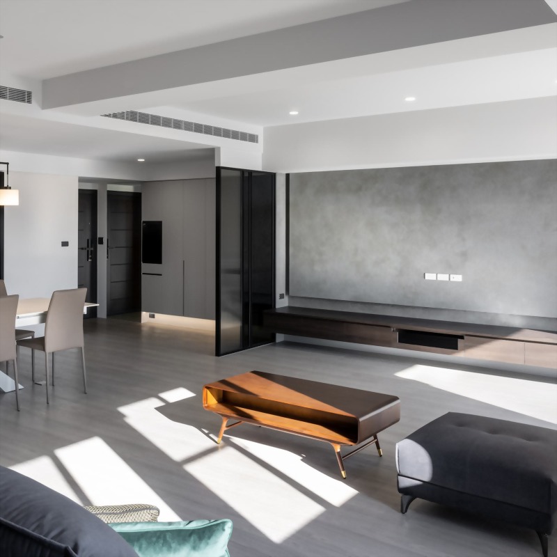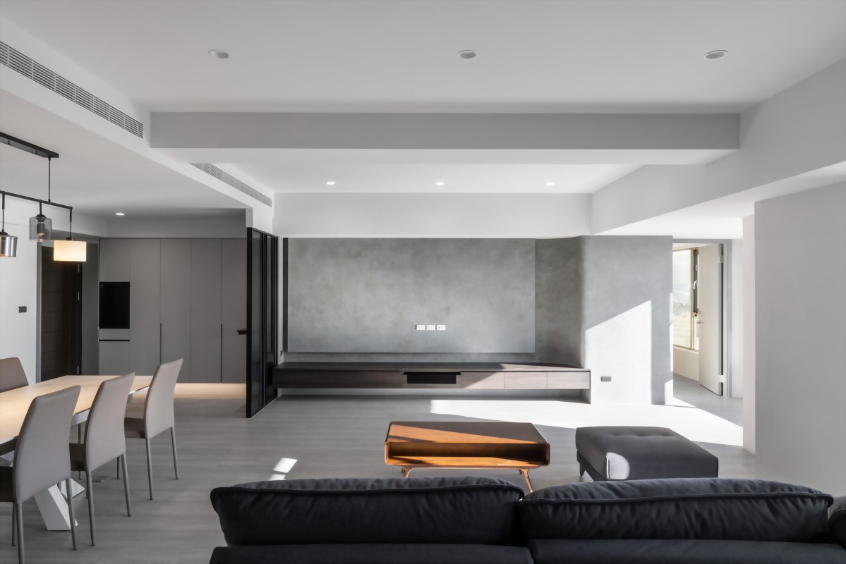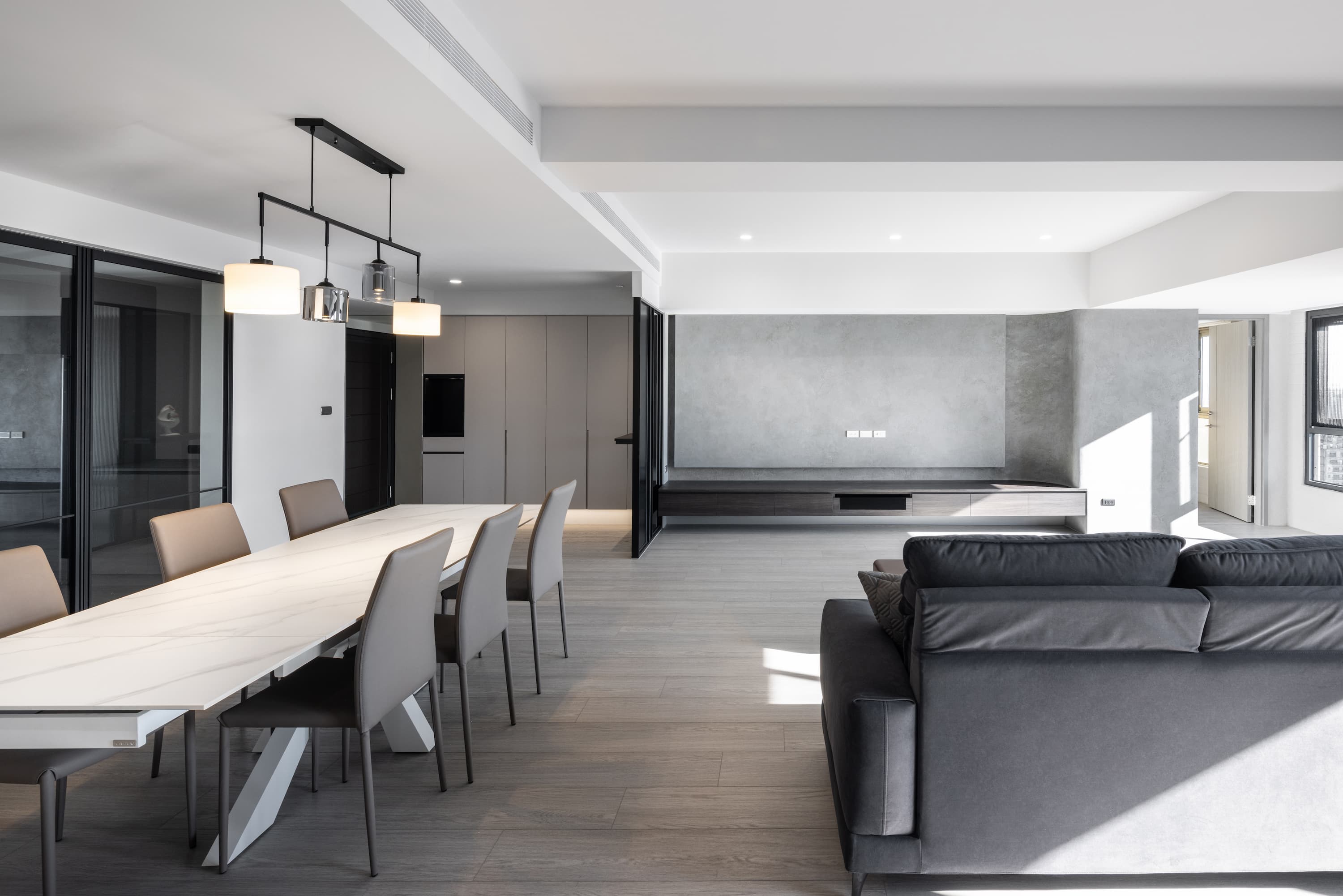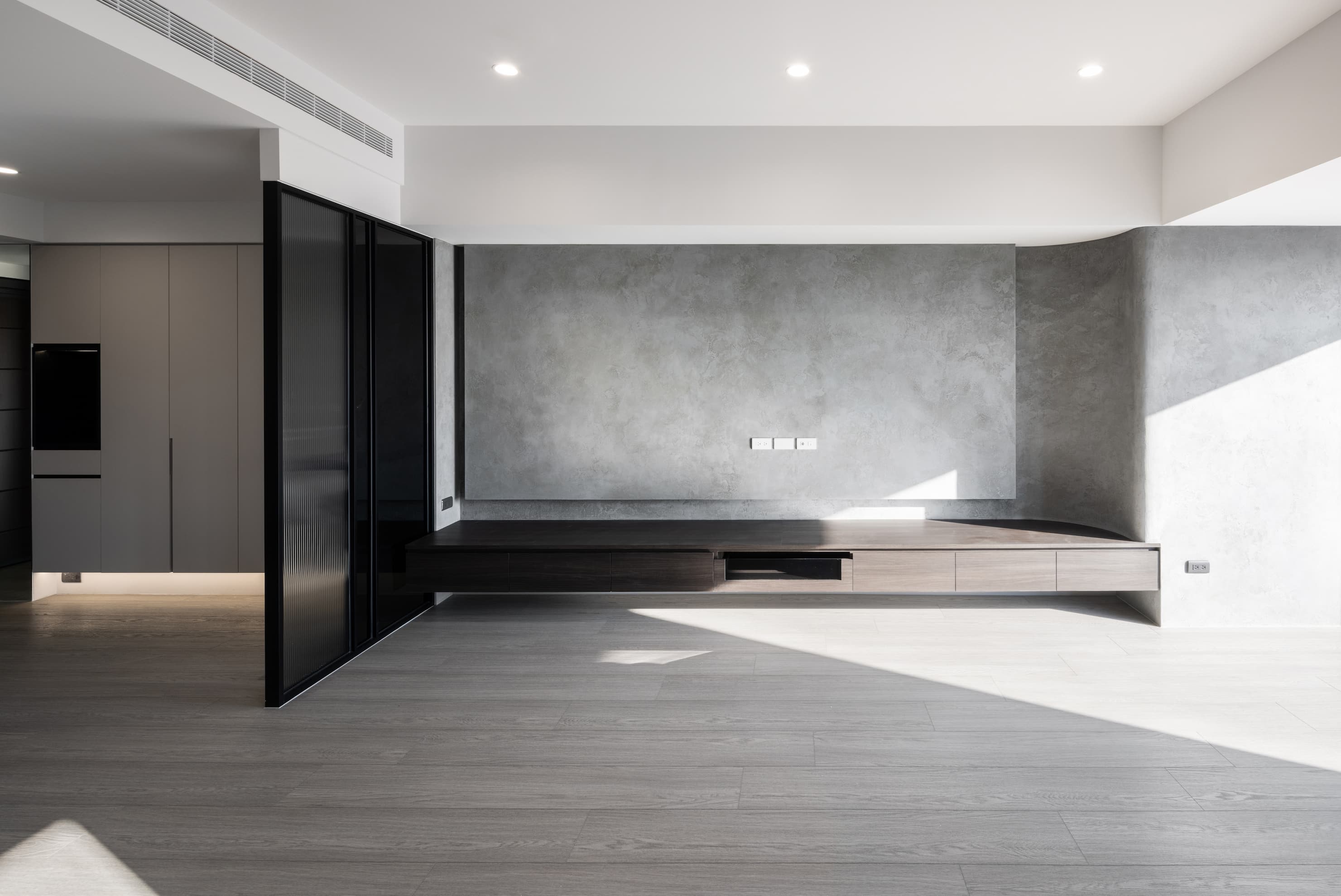 破曉般的淺灰色電視牆能讓整個空間更具沉靜感,而且因為使用特殊塗料,紋理相當獨特,使得牆面更有層次感和細節。在客廳後方的開放式收納櫃中,使用層板和鐵件結合的設計,既美觀又實用。它不僅能提供多種不同尺寸的儲物空間,同時也可以作為展示空間,讓你的收藏品得到充分的展示。
