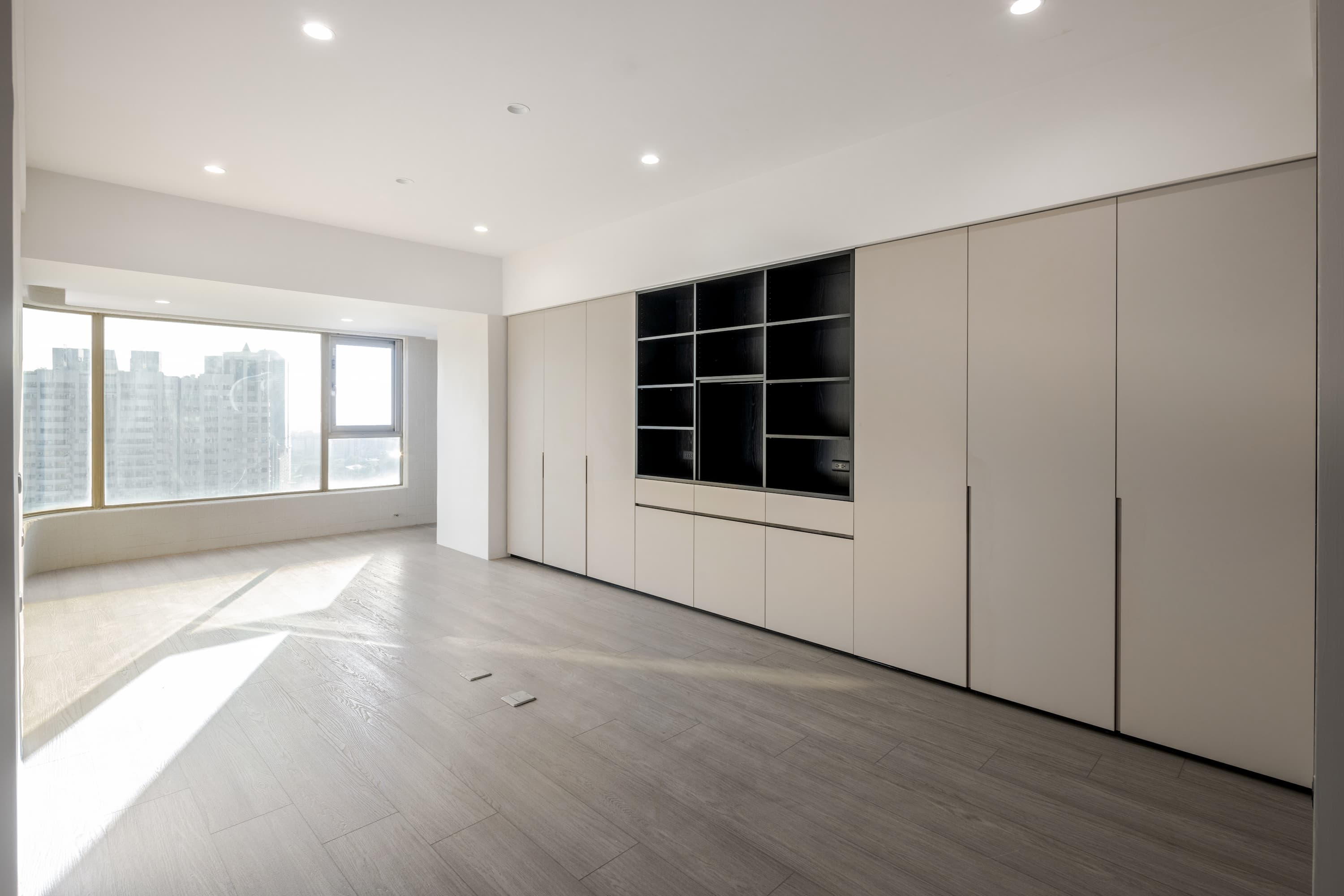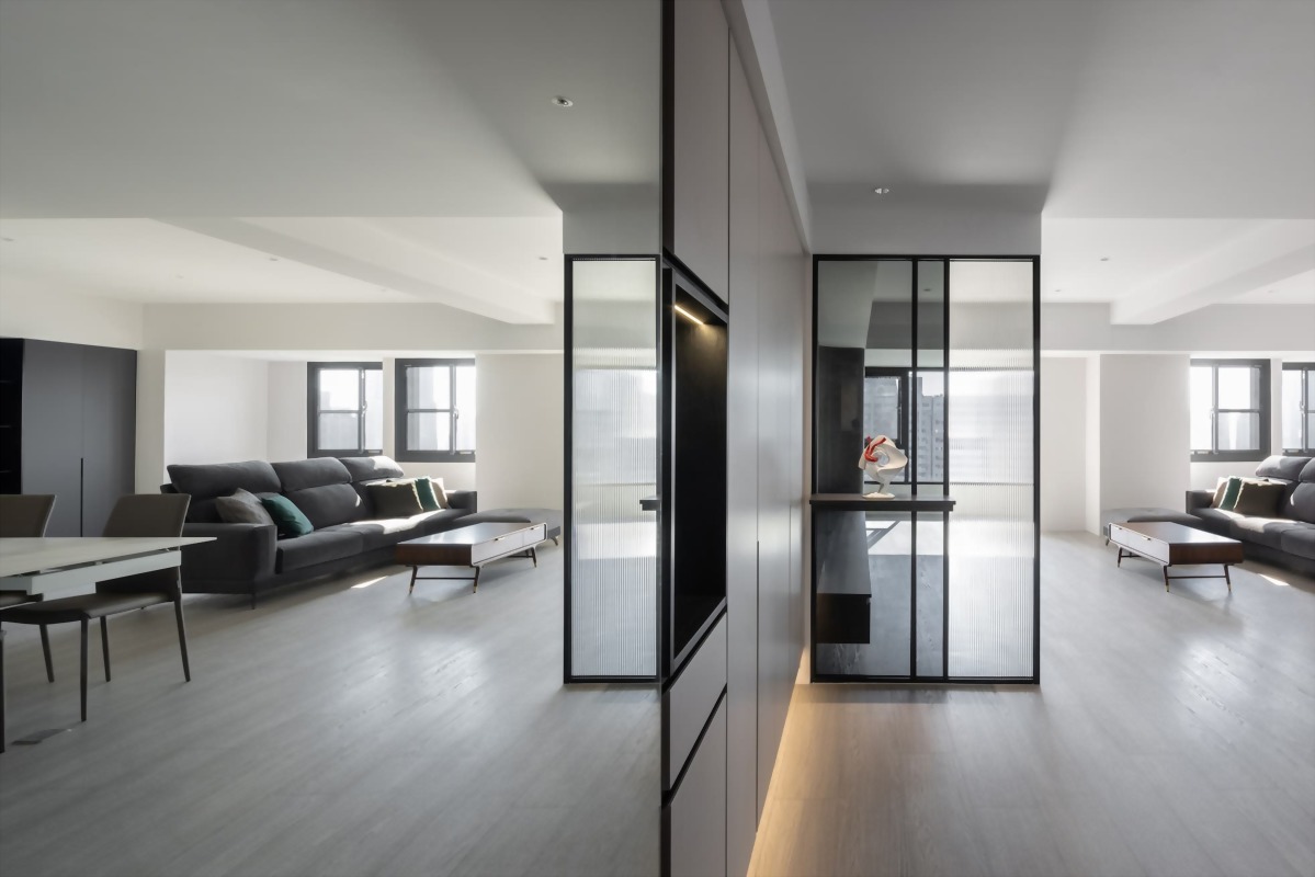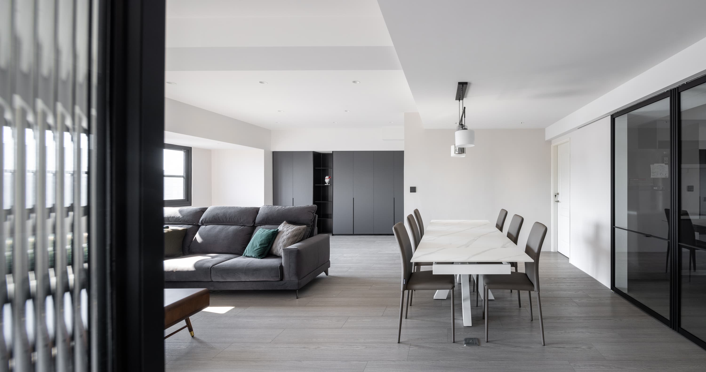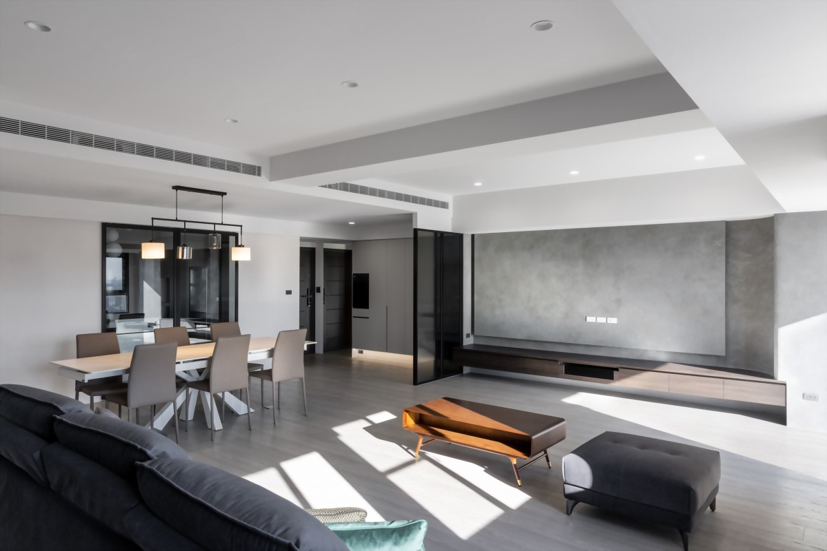 破曉般的淺灰色電視牆能讓整個空間更具沉靜感,而且因為使用特殊塗料,紋理相當獨特,使得牆面更有層次感和細節。在客廳後方的開放式收納櫃中,使用層板和鐵件結合的設計,既美觀又實用。它不僅能提供多種不同尺寸的儲物空間,同時也可以作為展示空間,讓你的收藏品得到充分的展示。