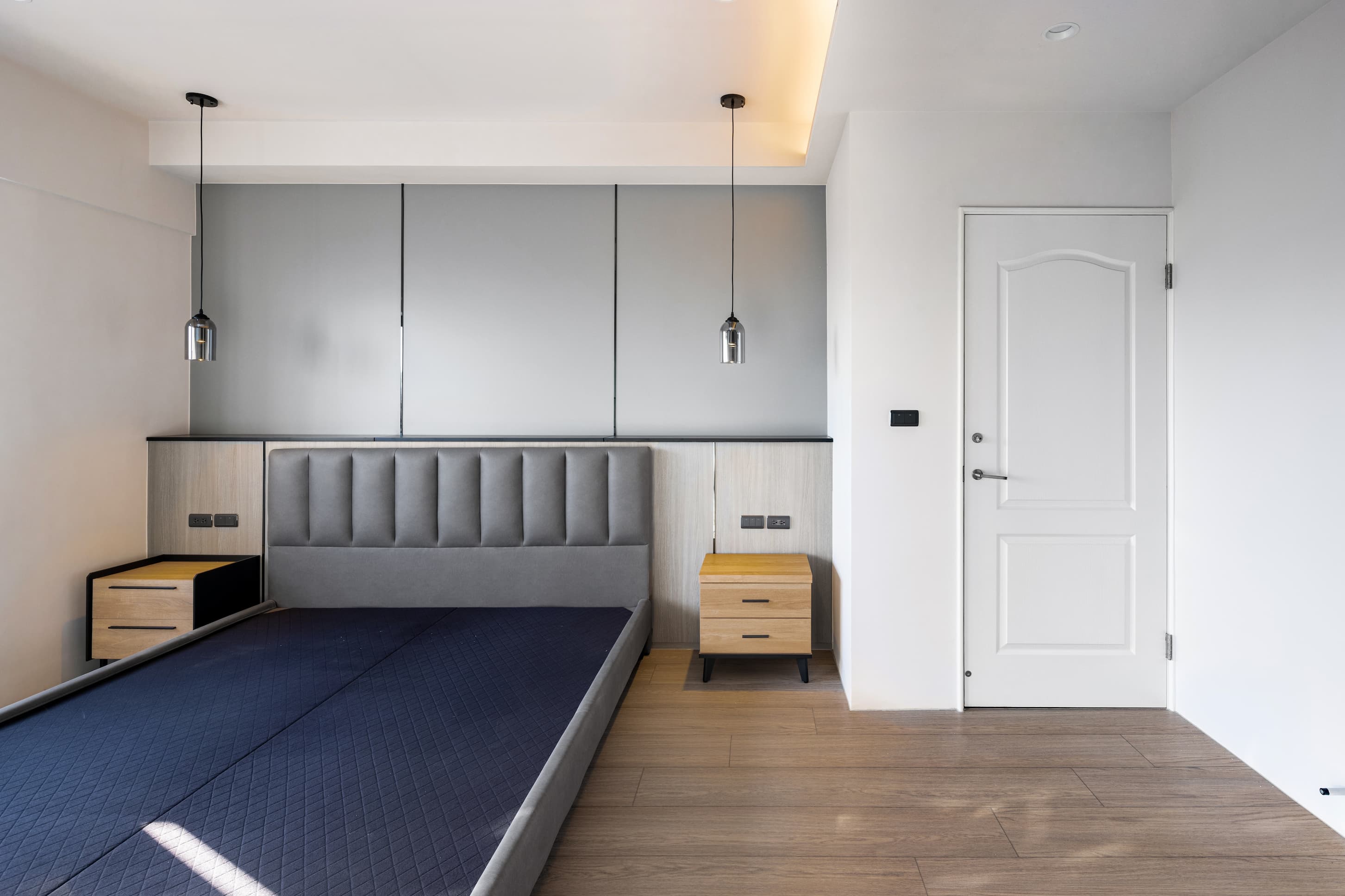 床頭牆大方簡潔,上方使用抑菌板材結合鈦金條,下方則運用木質調結合鈦金條,營造出現代簡約風格。此外,床頭牆厚度加大並且創造小平台,既可擺放裝飾品,又避免了因床頭擋到樑柱而帶來的不舒適感。此外,木地板的耐磨防刮特性不僅讓整個房間更具質感,也增加了地板使用壽命。主臥室重新翻新後,它猶如重獲新生一般煥然一新。
