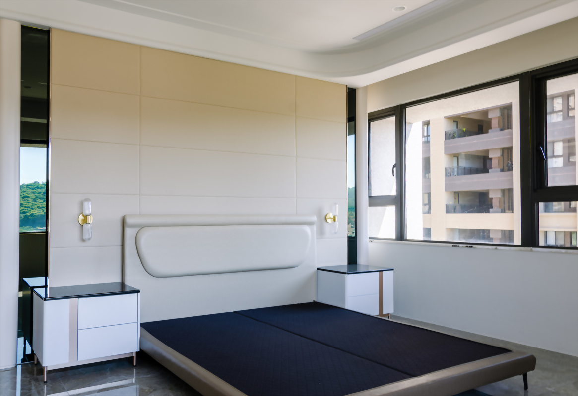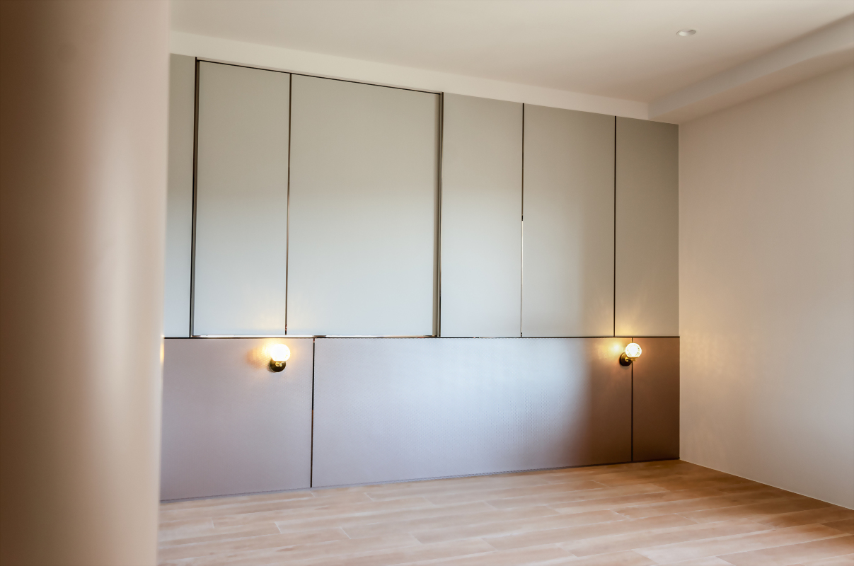 在床頭牆以推拉門的設計,隱藏了窗戶。