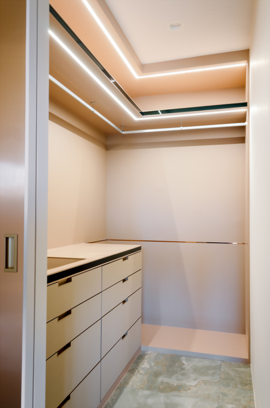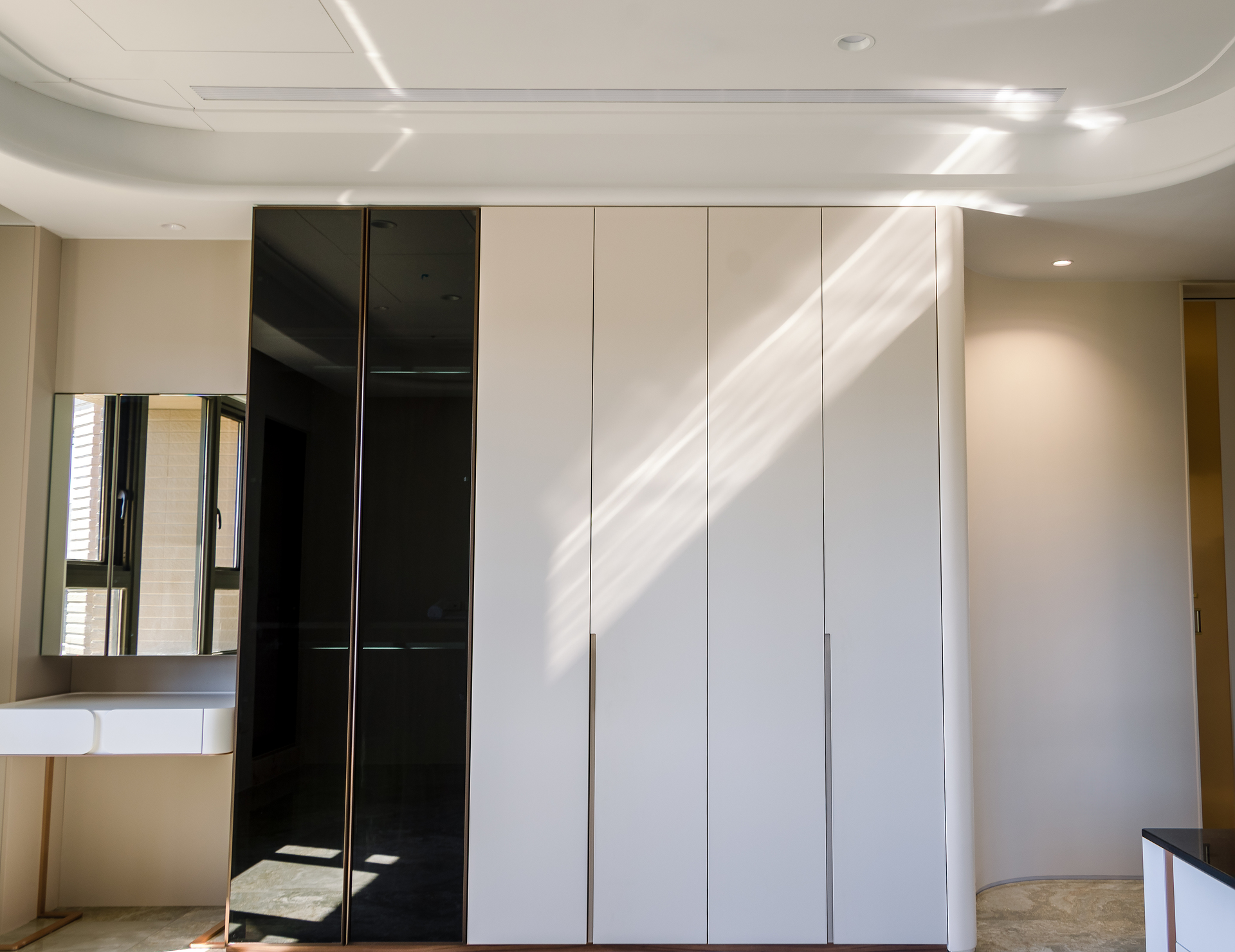 主臥規劃了黑色玻璃系統衣櫃,在材質上給予空間一種透明、輕盈的感覺。