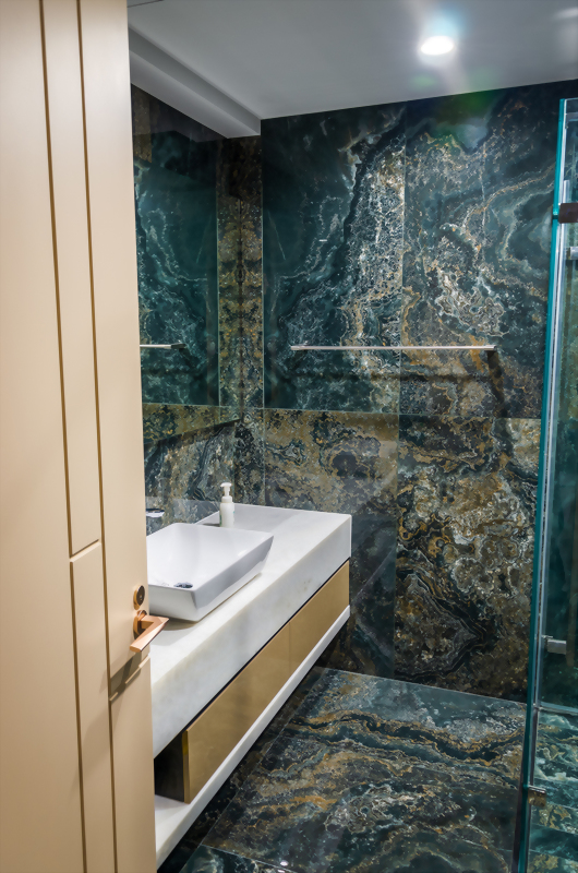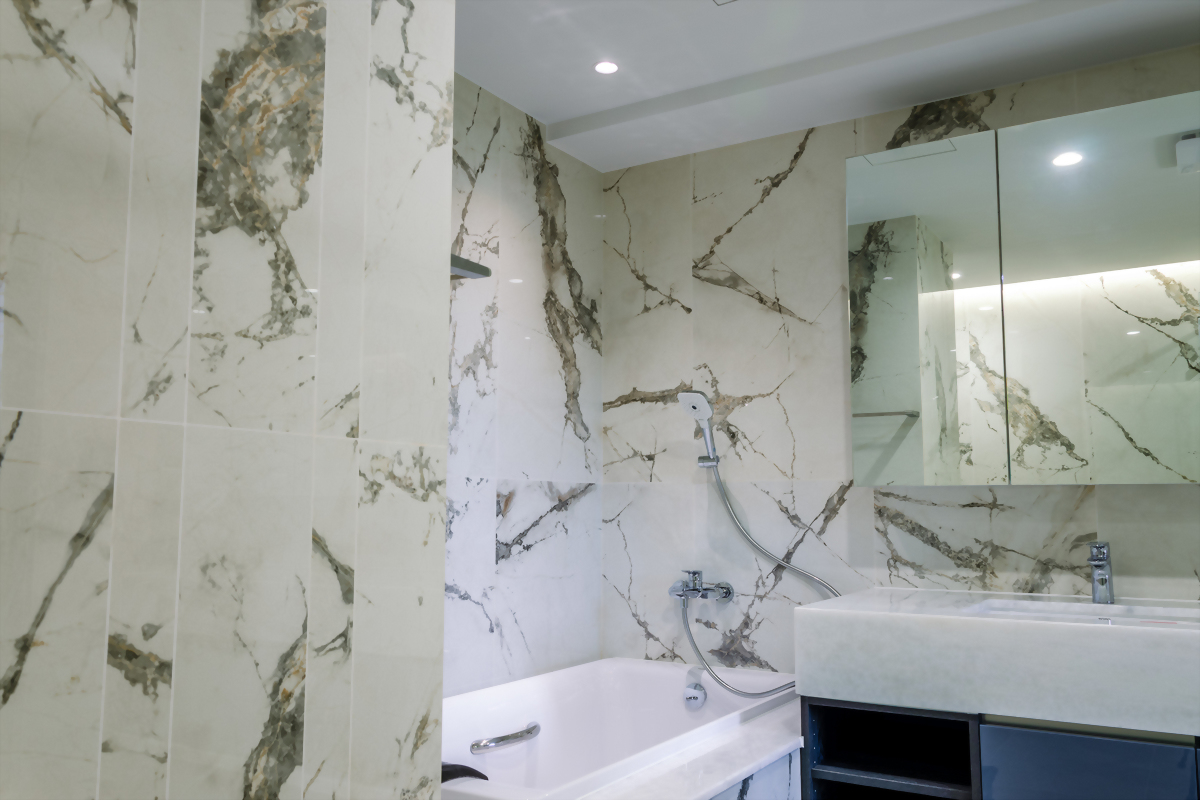 以大理石和玻璃為主要材料,打造出奢華的飯店式浴室,讓屋主每次沐浴都能完全放鬆。