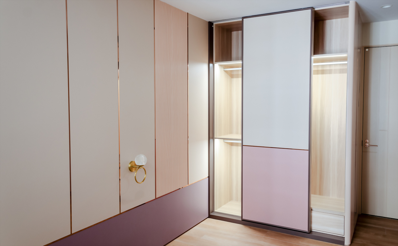 房間收納機能,以系統櫃作衣櫃,並且設計一個化妝桌,方便女生在私人領域使用。