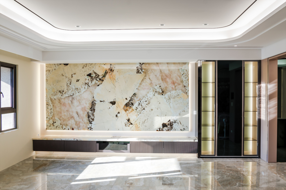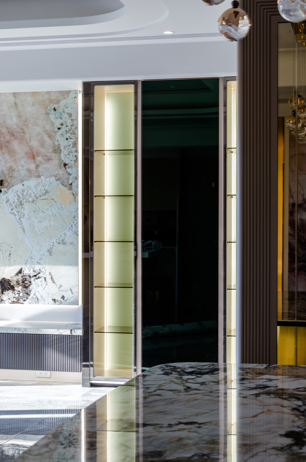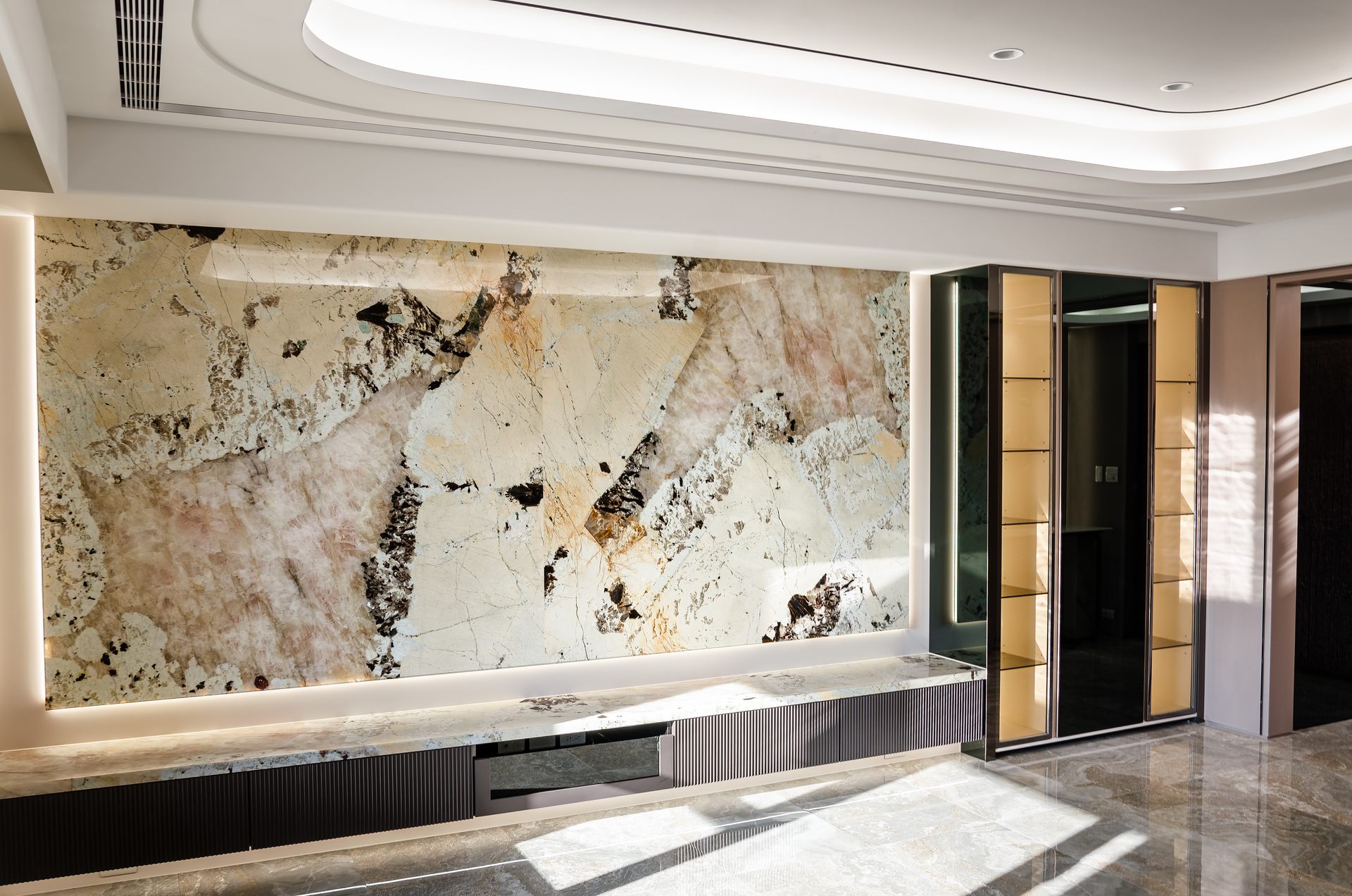 在入口處規劃了玄關端景牆,結合多種材質(麗鉑板 + 裱皮革 + 噴漆 + 鈦金板),營造奢華美感。