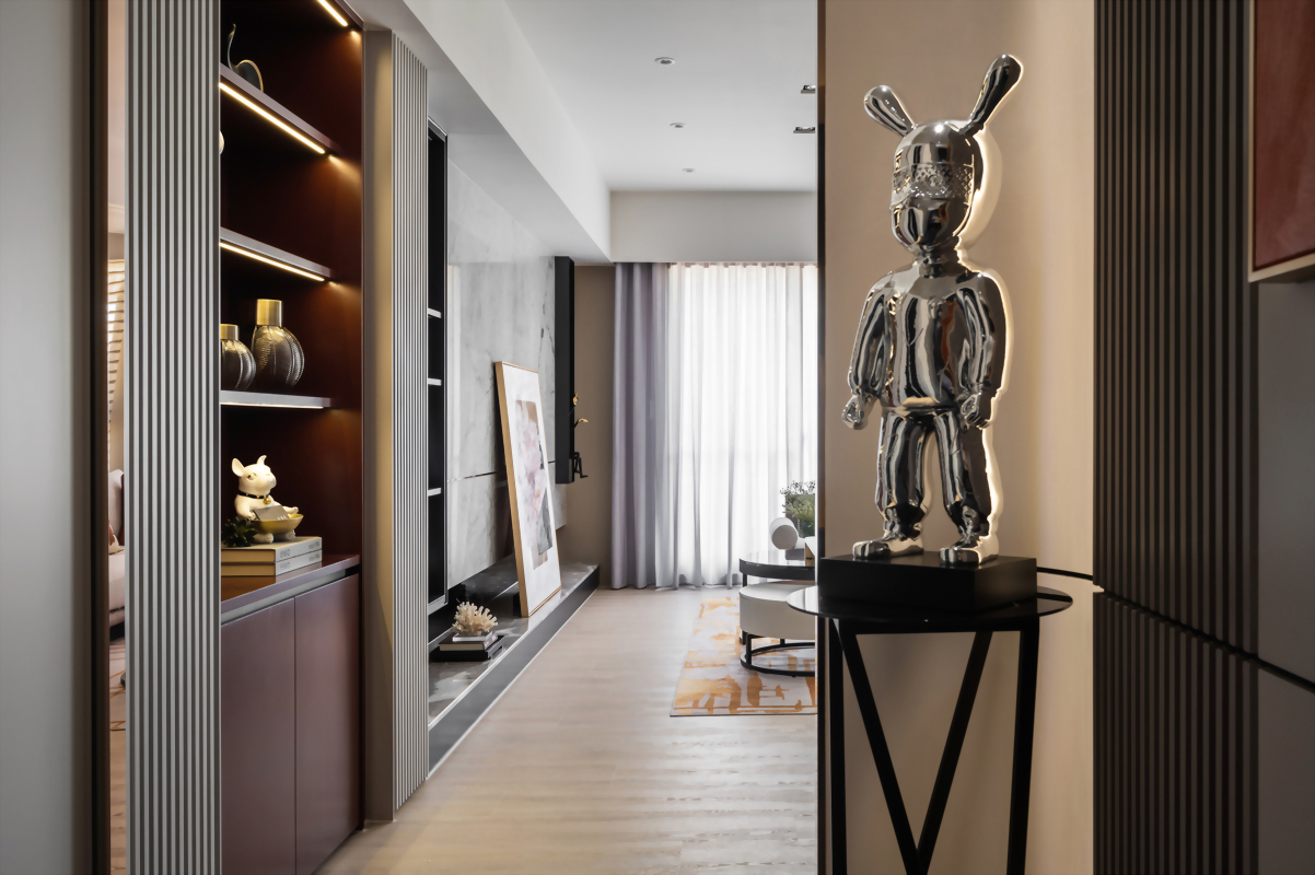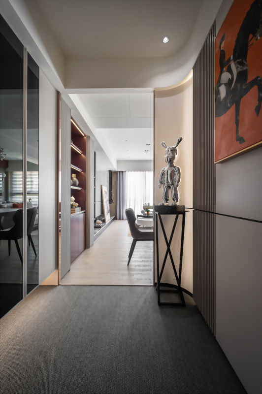 首先抓住目光的即是猶如高級飯店迎賓般法式風格的玄關廊道區,有別以往的玄關很容易讓人一眼看穿,這次透過本身空間設計格局條件優勢,順勢營造出玄關的空間設計,在室內設計師靈巧的運用鏡面牆壁、鈦金屬、軟裝家具、燈光照明,打造大方的奢華感,並給人一種放輕鬆的高貴生活步調。