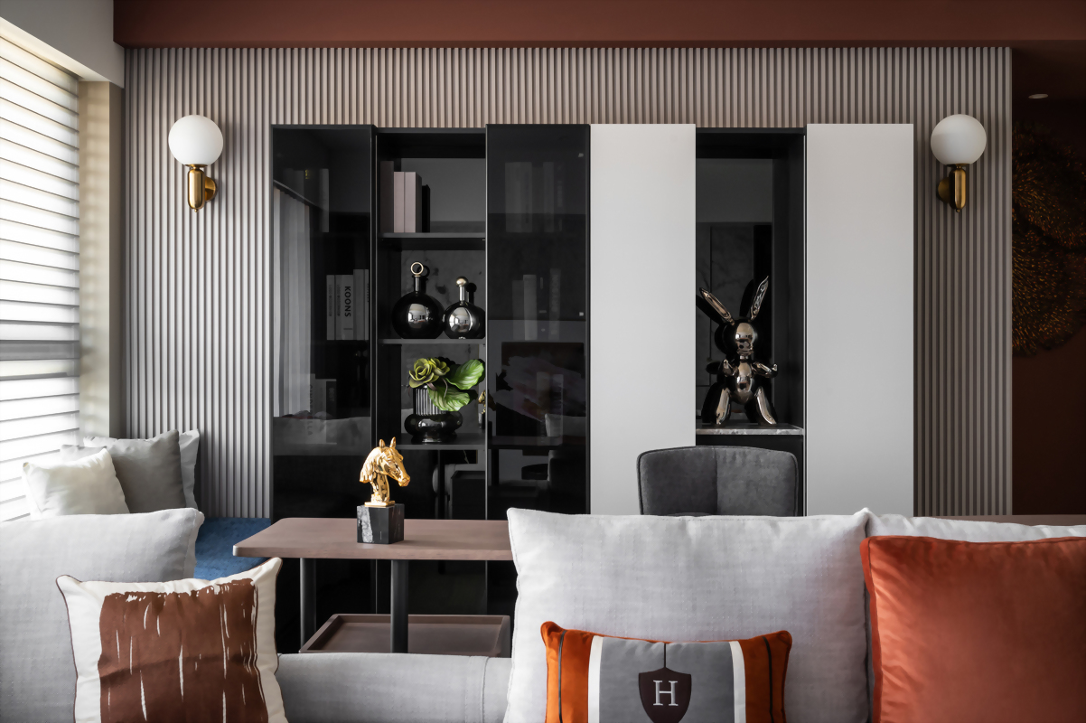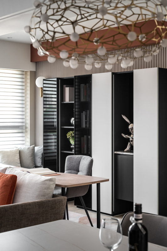 開放式的書房空間設計,拉大了空間感,相當適合與家人共享,拉近了家人的距離感,在室內設計上,與客廳相融合,後方的書櫃壁面結合鏡面設計,底層壁面為木柵質感紋理及現代感復古圓燈,讓客廳與書房的空間設計合而為一,透過裝潢設計完全看不出違和感,更增加了一處家人互動的小空間。