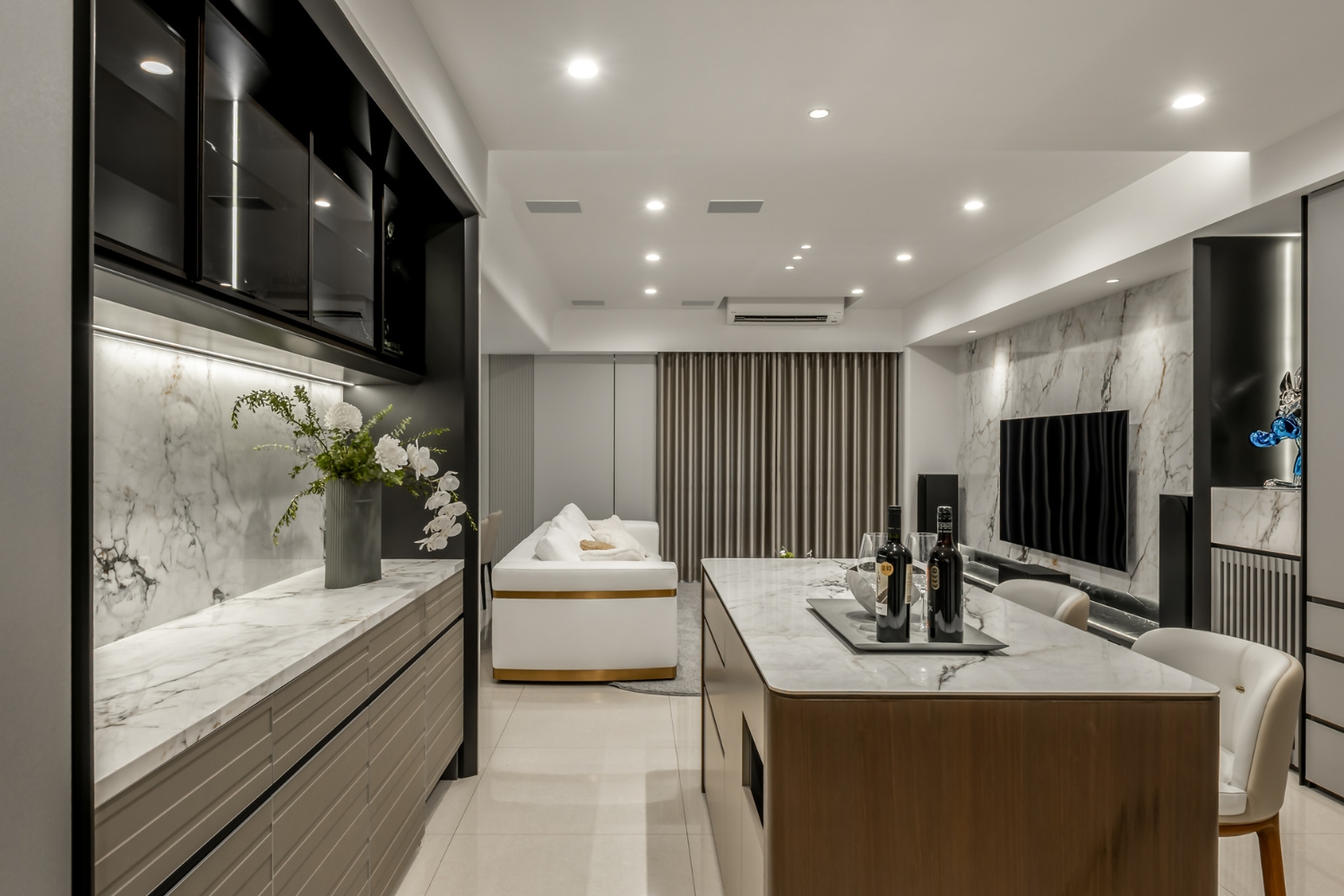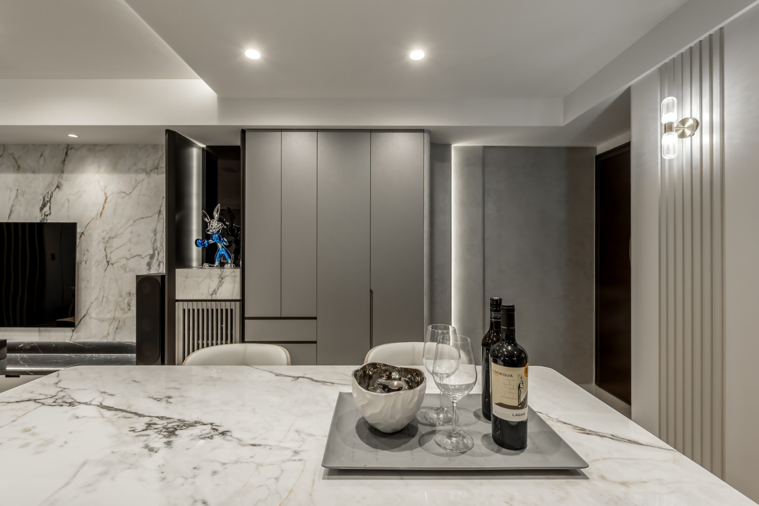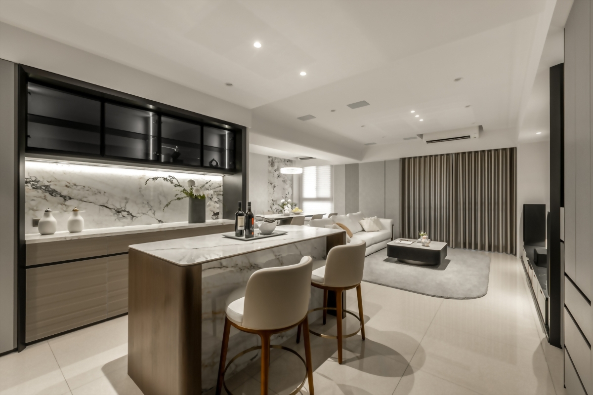 入門處首先看到的,是許多屋主心中小聚NO.1的中島吧台設計。中島枱面使用了大板磚,不怕酒、咖啡等有色飲品,超級好清理,迷人的石紋設計與客廳設計融合很有感。特別一提的吧台下的貼心:多功能收納以及隱藏式垃圾桶區域,做為一個希望他擁有很多功能的MINI中島吧枱,在這裡小酌、用餐、備餐都很適合,收納的便利性,設計師也都幫你想好了喔。