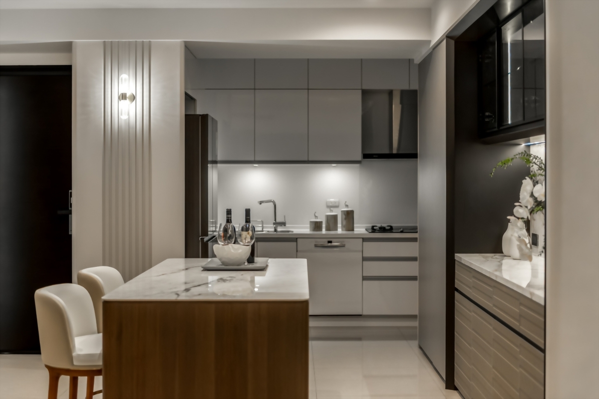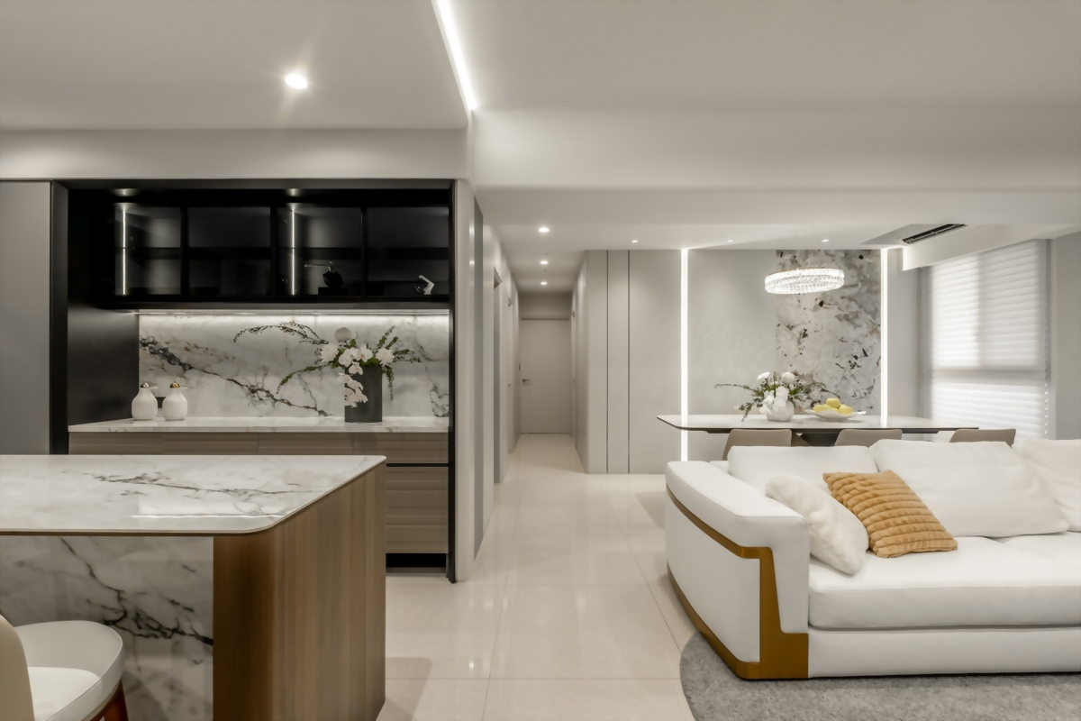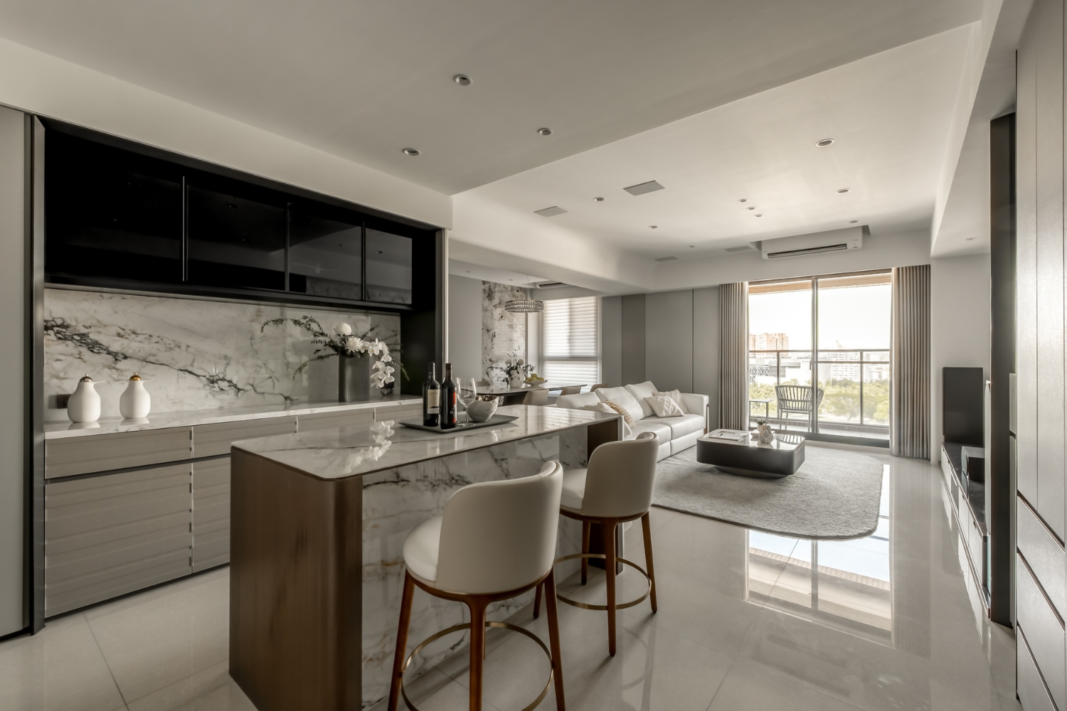 入門處首先看到的,是許多屋主心中小聚NO.1的中島吧台設計。中島枱面使用了大板磚,不怕酒、咖啡等有色飲品,超級好清理,迷人的石紋設計與客廳設計融合很有感。特別一提的吧台下的貼心:多功能收納以及隱藏式垃圾桶區域,做為一個希望他擁有很多功能的MINI中島吧枱,在這裡小酌、用餐、備餐都很適合,收納的便利性,設計師也都幫你想好了喔。