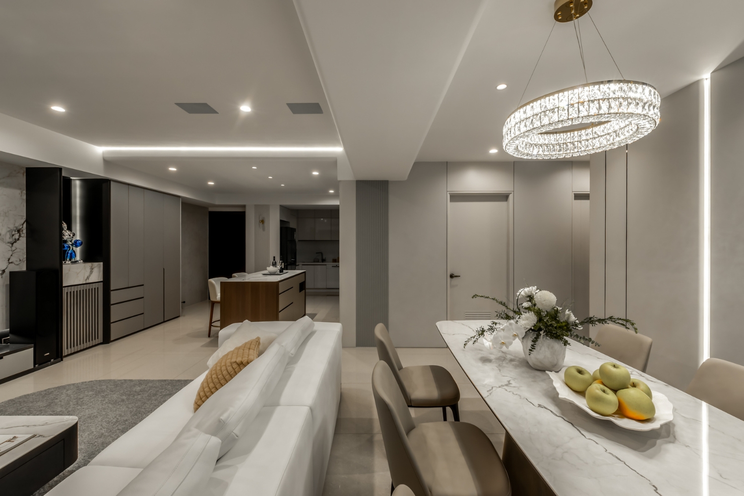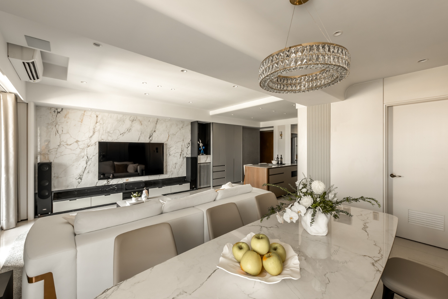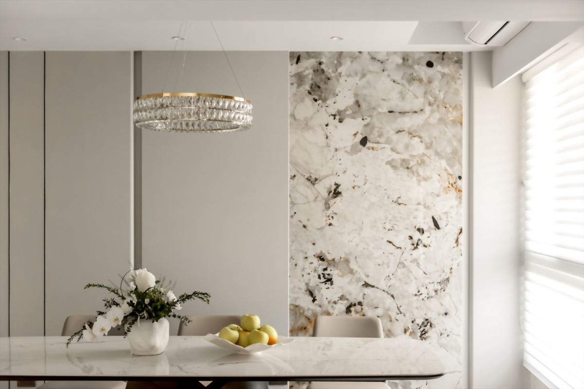 牆面的設計以石紋大板磚及純色系統板來做不同材質的拼接,而水晶燈的擺色位置正好在系統板前,更能襯托出它的精緻美。