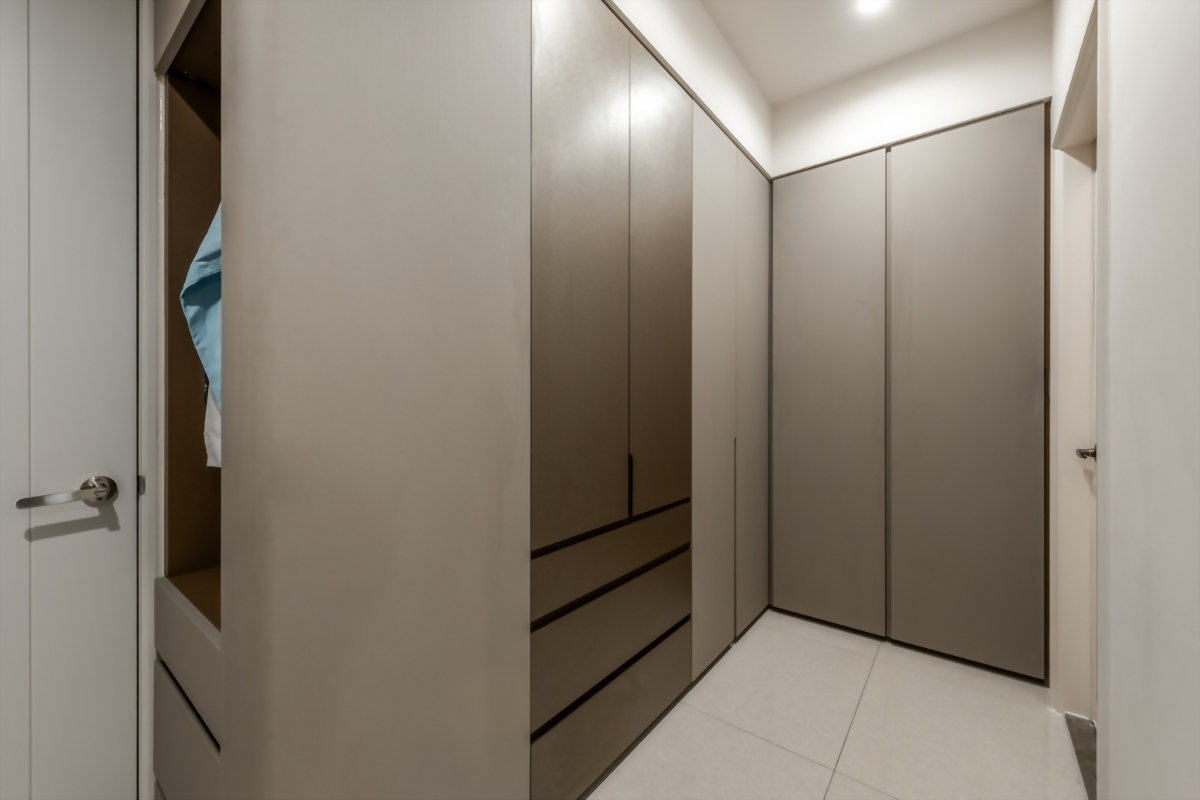 在進入主臥室睡臥區之前,先經過的是一處女人心中的夢幻地帶:更衣室。約略1.5坪左右被設計室靈活借來的空間,再利用了「系統櫃體分類術」把收納空間效率最大化。不管是吊掛長大衣、抽屜的集中折疊收納、雙層衣櫃以及藏於櫃內的全身穿衣鏡,在這小空間中都完整展現。