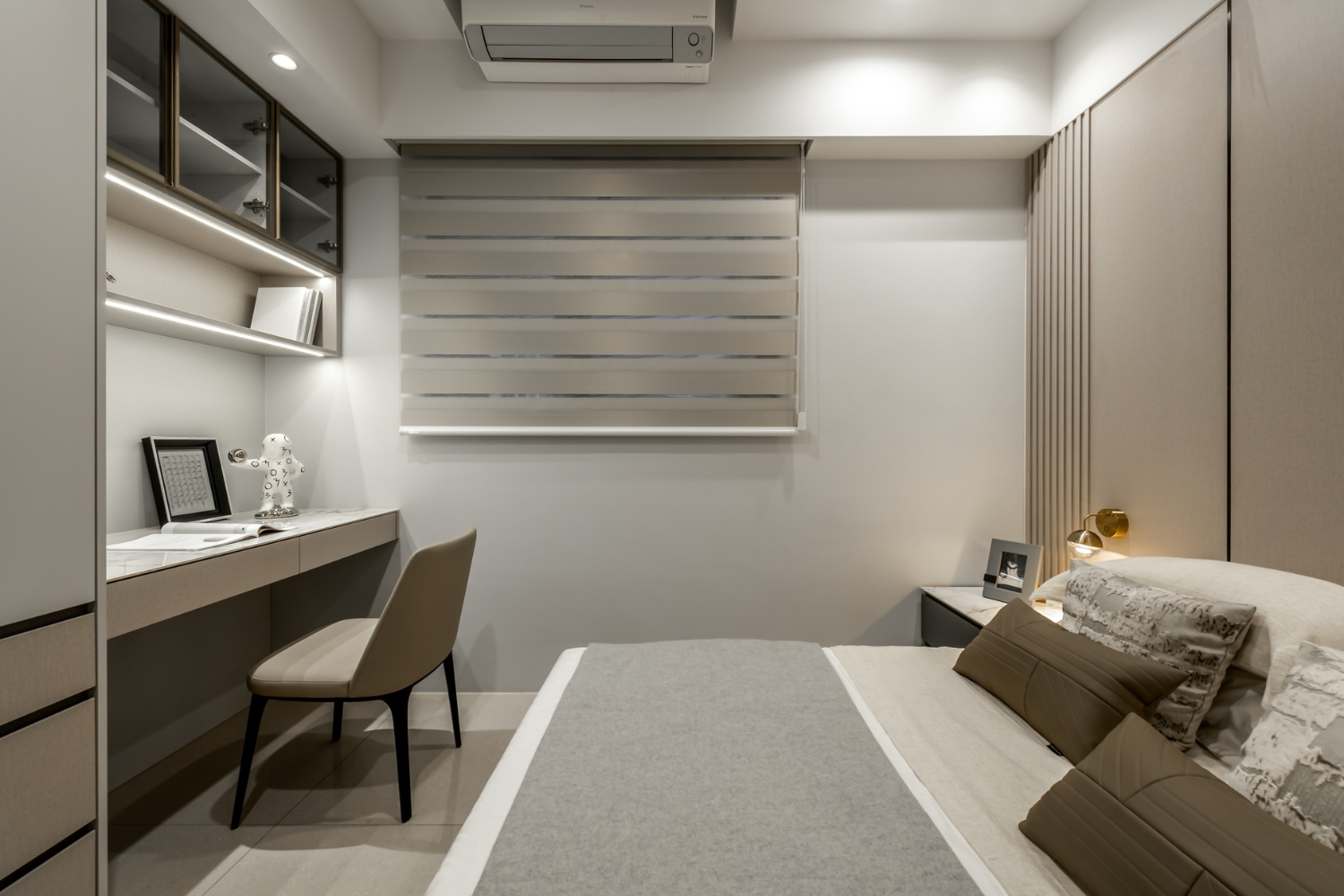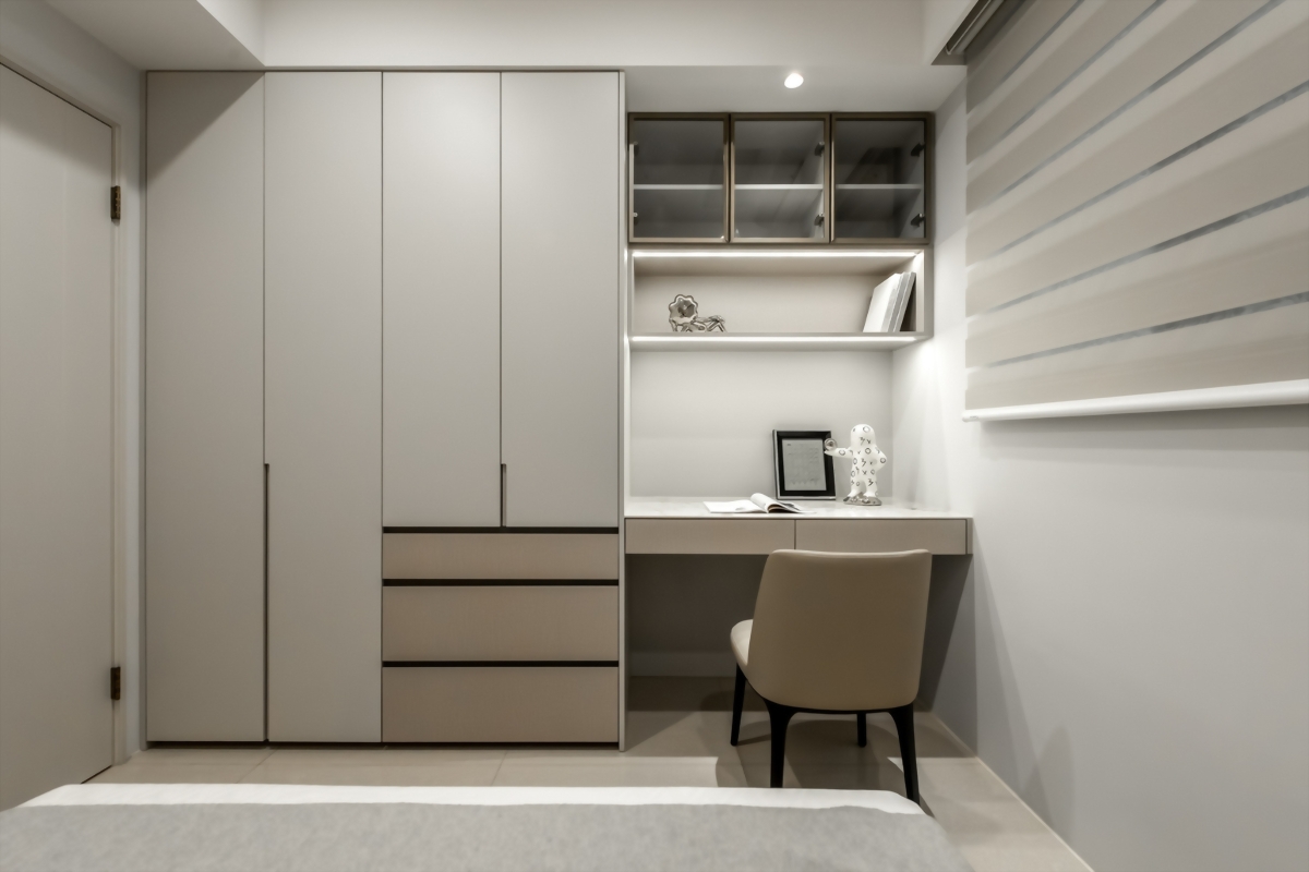而另一間次臥設計,功能的設定上為屋主招待客人時的「真客房」,總體設計以「精緻飯店感」再加入一點也不少的收納機能為導向組成。屋主希望客人入住時,都可以感受如入住飯店般溫暖、備受禮遇……