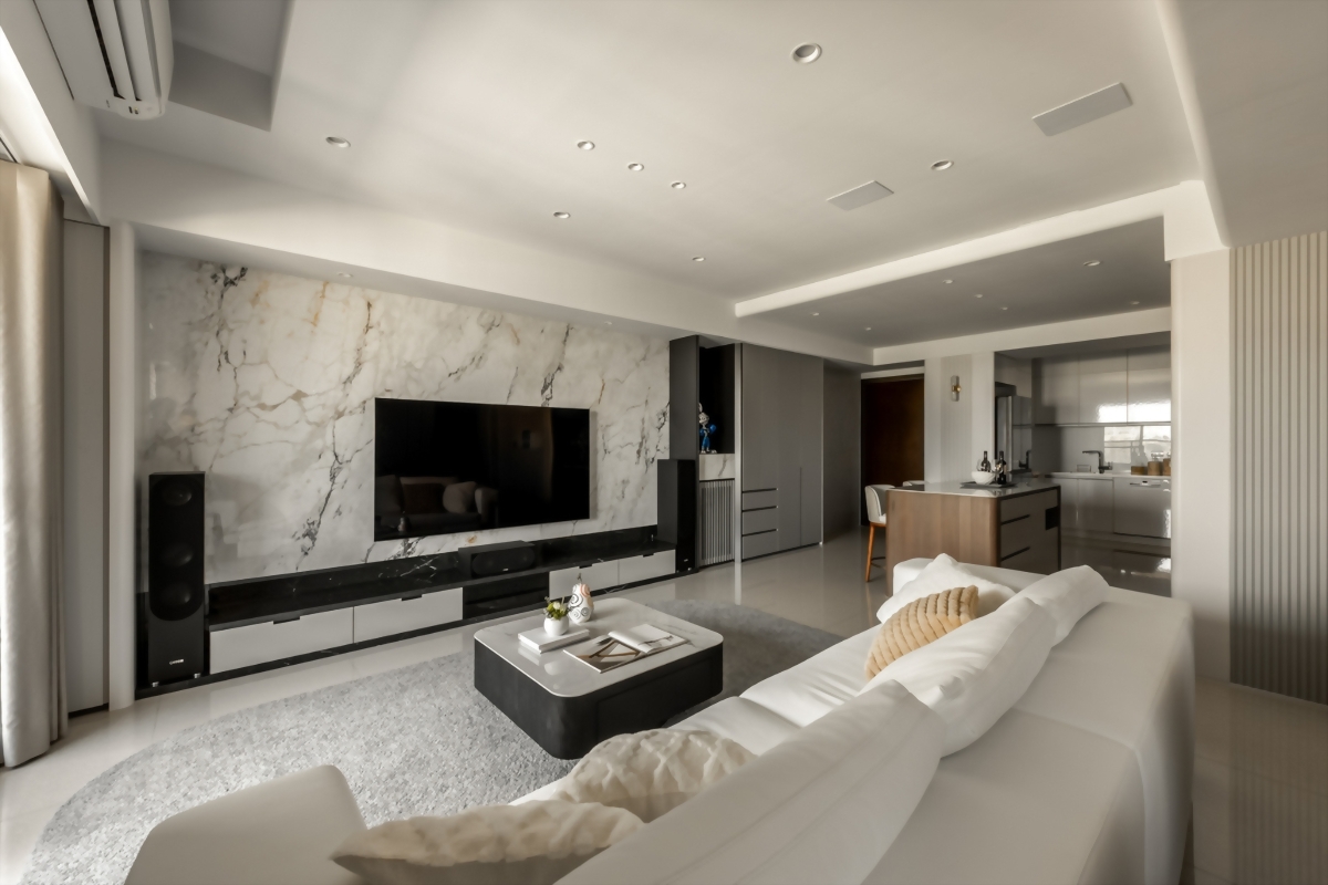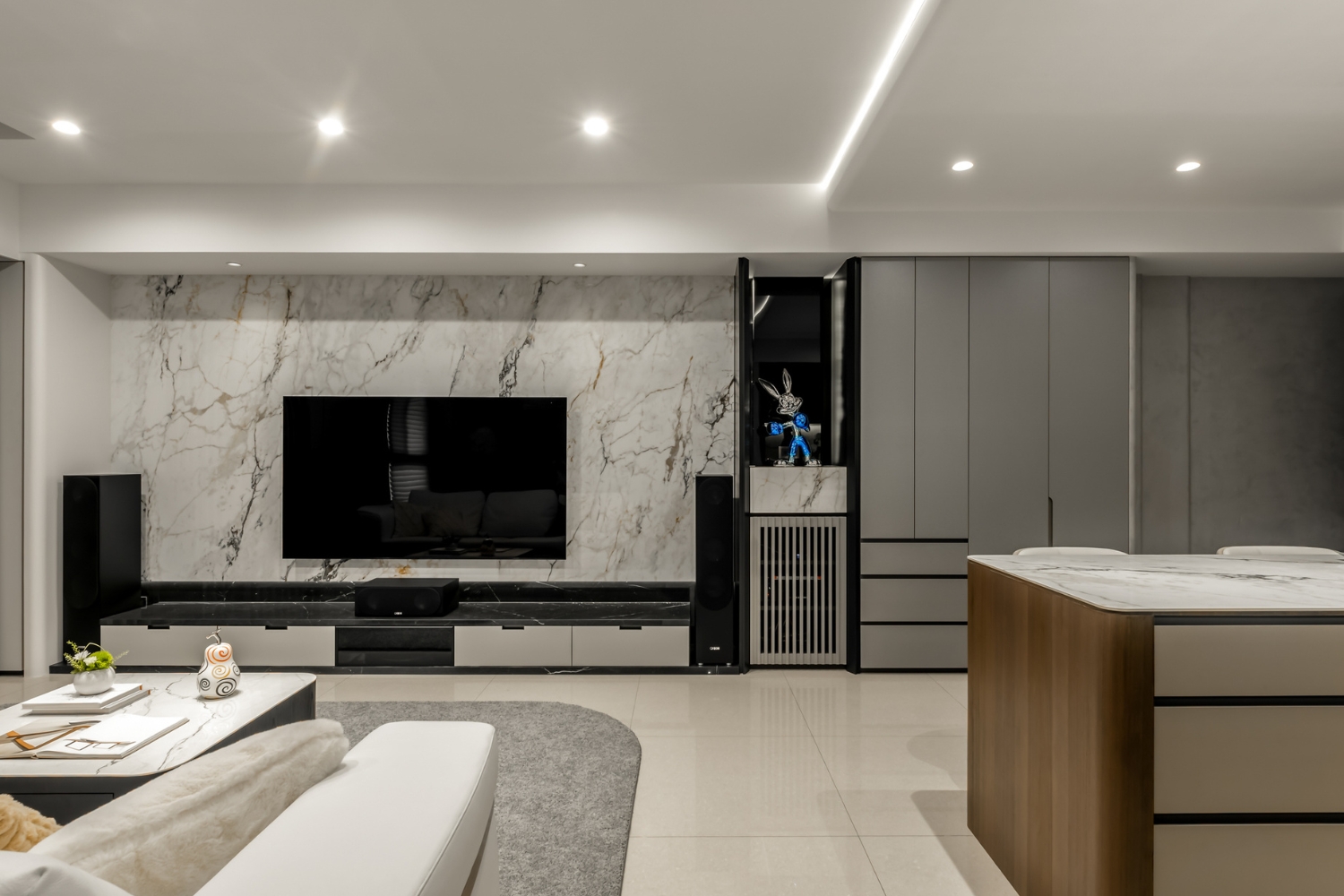 打造空間的簡約及輕奢感,從玄關、中島吧枱一路延伸到客廳的大面積電視牆,石紋大板磚的多面向應用,可說是功不可没;幾乎零接縫拼接感的大牆面,氣勢、質感可是一點都不輸給原石喔!