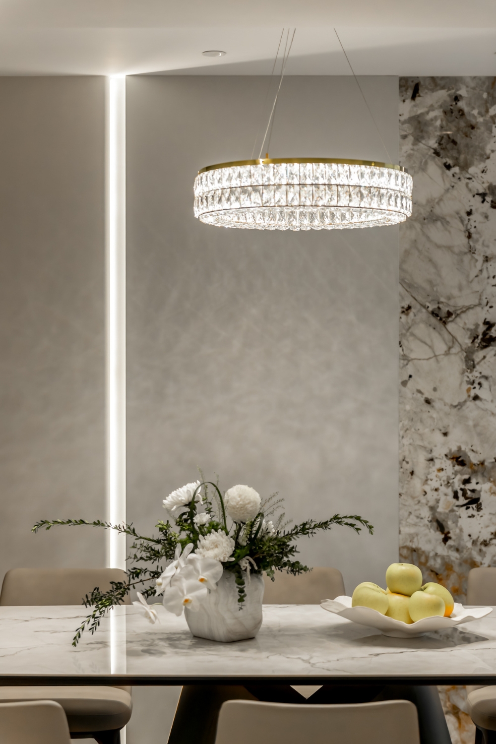 用餐氛圍,是家人好不容易共處時最重要的環節。所以在餐桌中間,先來一盞讓光影能投射出各式彩虹倒映的水晶燈。