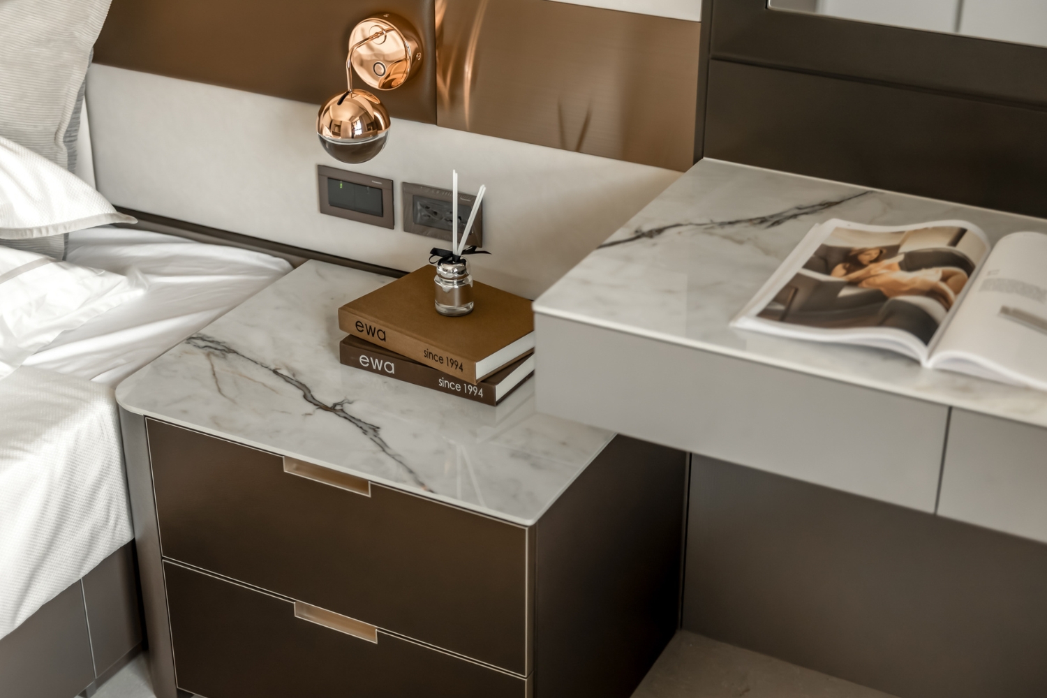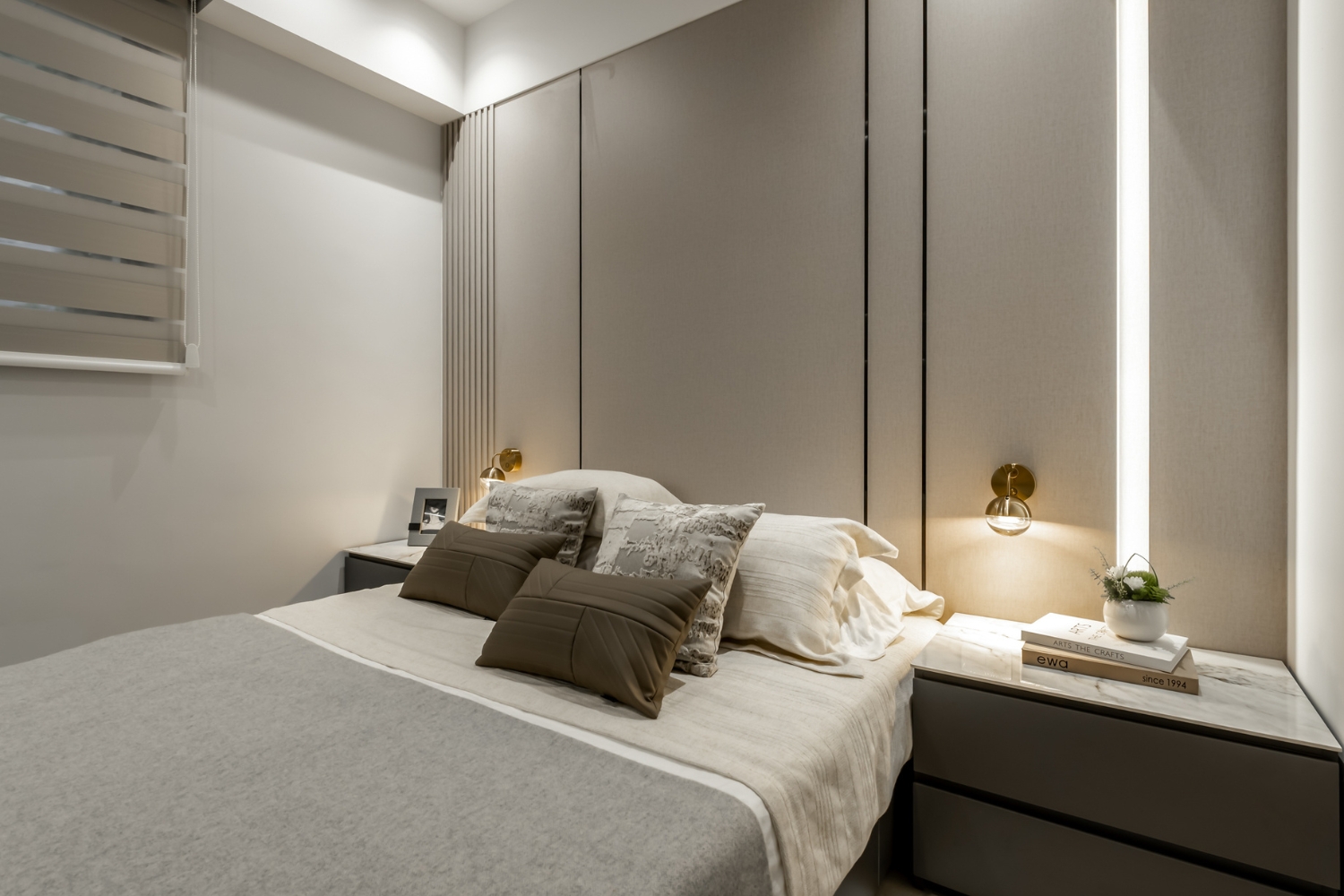 在主臥室的睡臥區部份,則是屋主最期待的設計重頭戲,以輕奢風格為主的設計,在床頭就運用各種不同材質做出層次感。以棕、裸色做為素雅的色彩基底,再加入如皮革、鈦金飾條、玫瑰金的床邊壁燈……不同的金色搭配出一種漸進式的美感,搭配上燈光,展現出輕奢不張揚的貴氣感。