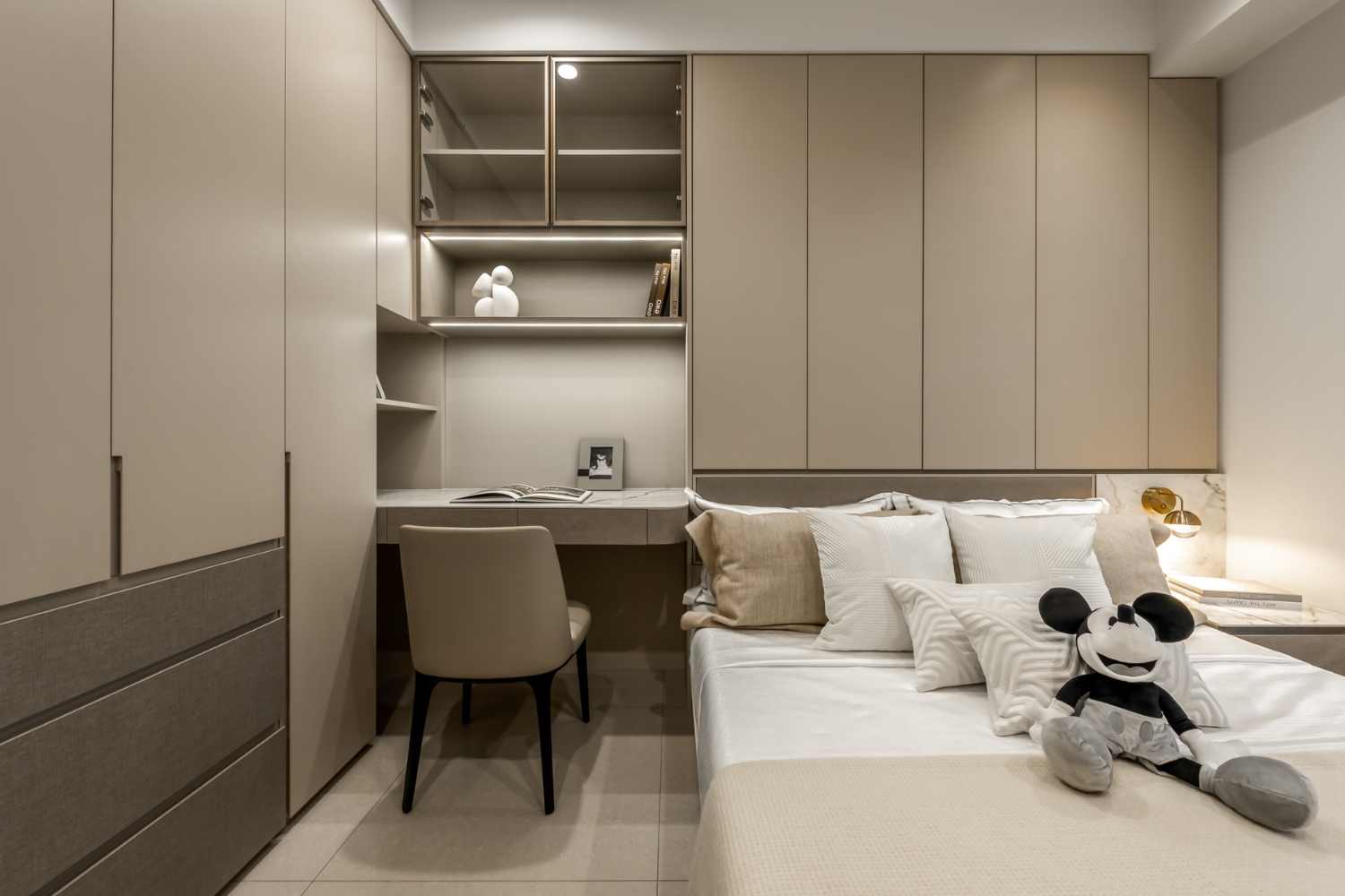 在兒童房設計的部份,主打的是一個「小空間收納大魔術」!亞麻色的配色,達到穩定、溫暖的效果,而對於房間來說,維持整潔的收納就是維持舒適度的核心。從床頭到床底,書桌收納,每一處能高效利用的空間,都毫不違和的被加入了「收納」的行列。