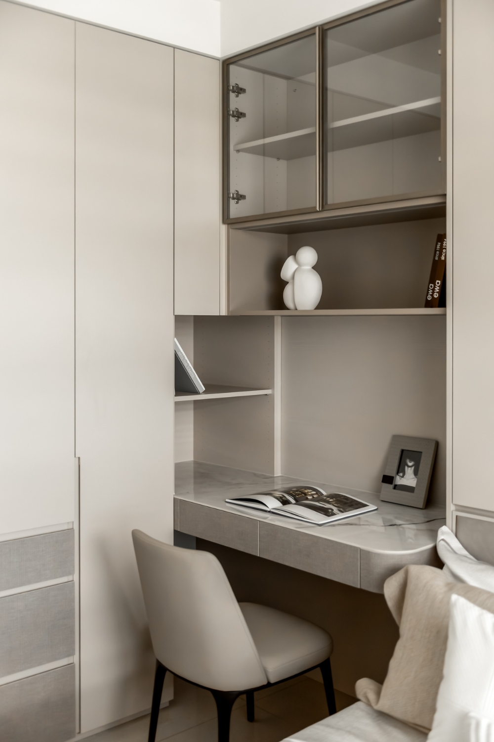除了一定要有到位的好眠氛圍,整體床頭的設計也用了更多輕奢小幸福必須的元素,如由雙皮革混搭拼接在床頭的精緻感,同樣能呈現時尚感的還有長虹玻璃、金屬框邊組合而成的展示收納櫃,可以放入屋主常用的精品包收納,做為日常展示也超級時髦。