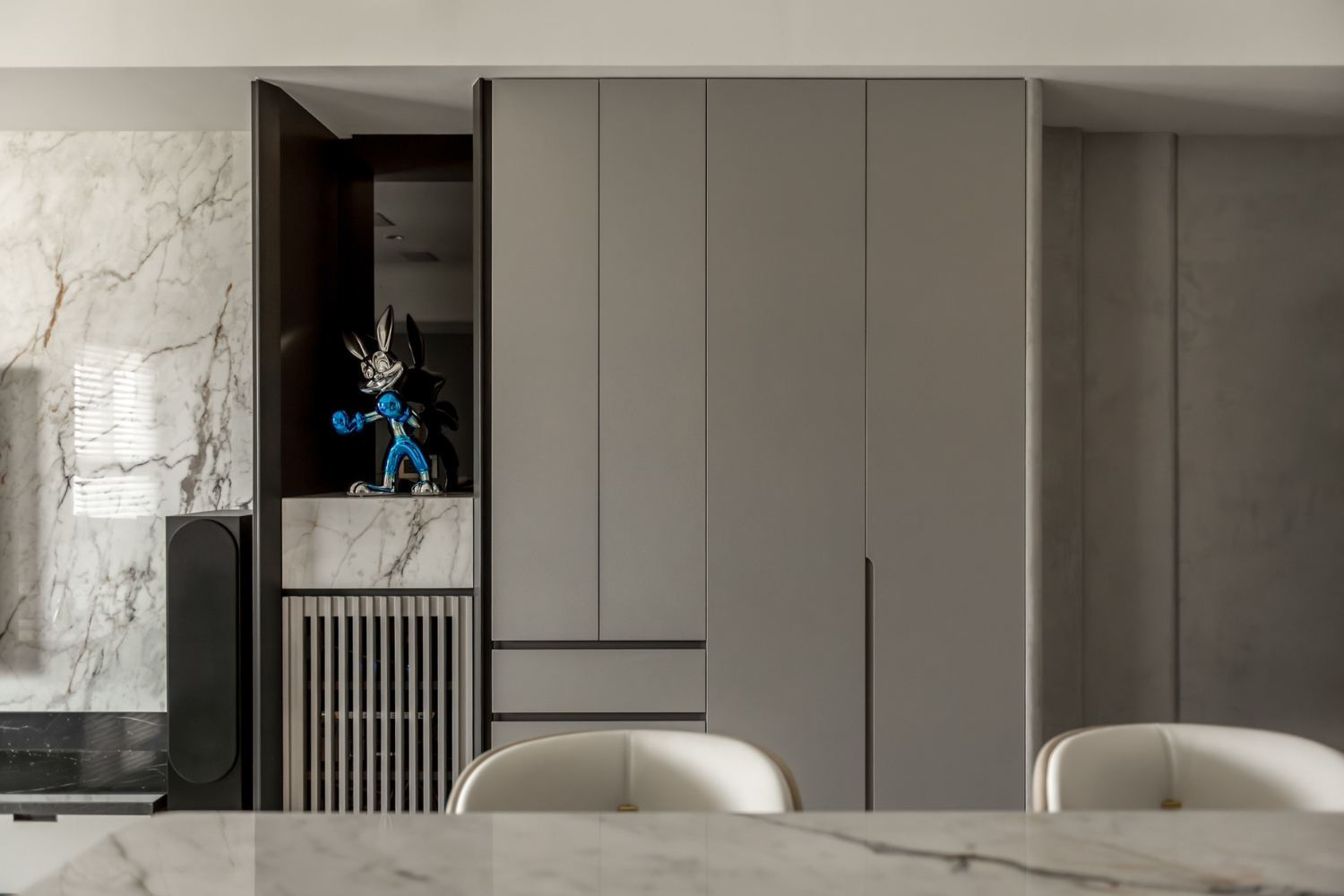 位於後方的備餐櫃,同樣是美麗與內涵兼備。黑玻門片的吊櫃設計,清透很有輕奢設計感,平台同樣使用了石紋大板的設計,下方櫃體則是皮革材質並帶點線條設計感,並為掃地機器人留下一處專屬住宅,精品宅的飯店設計,真的是讓人愛了。
