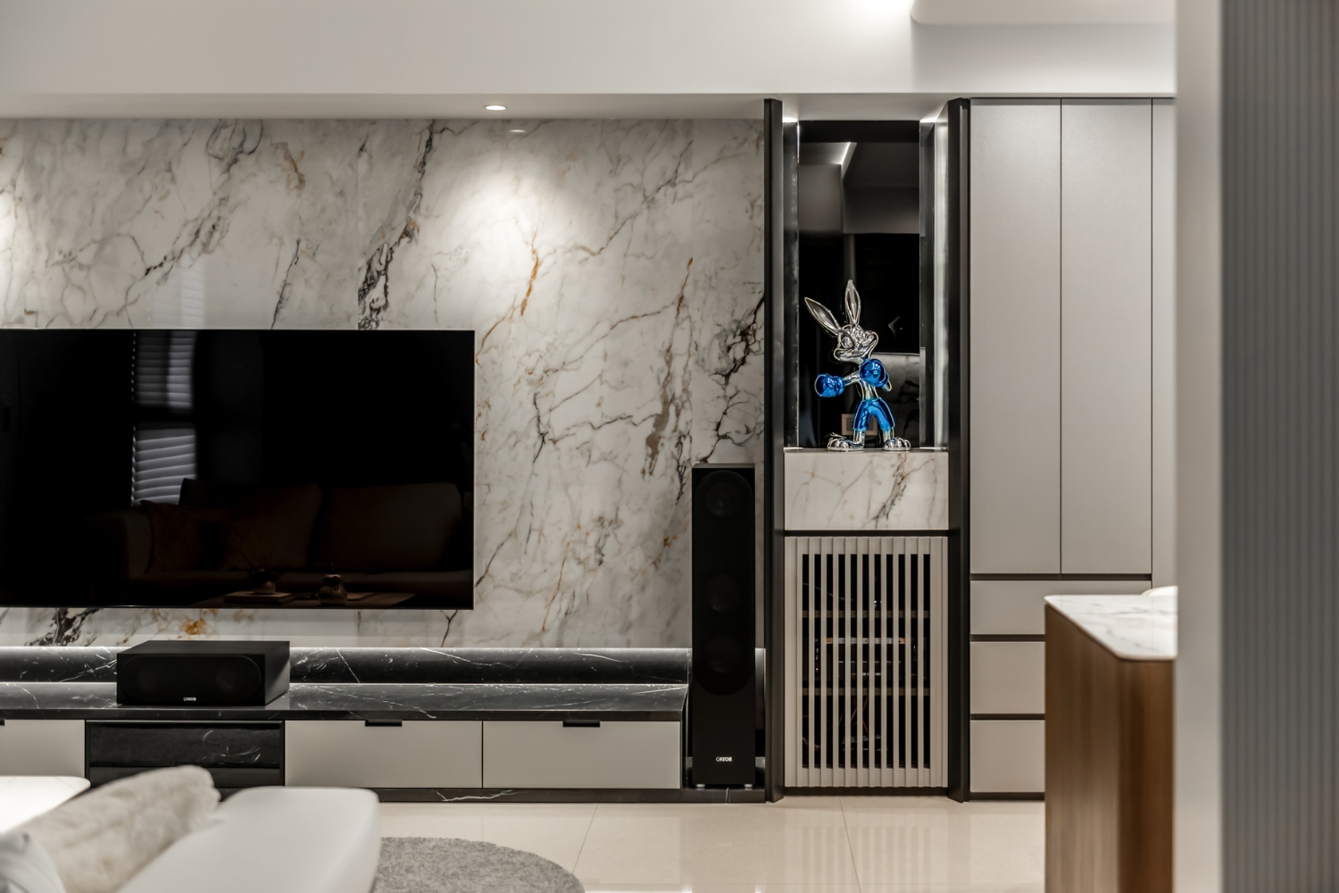 玄關櫃除了系統櫃之外,接近客廳的區域也以黑色烤漆玻璃、石紋、企口等不同材質無違和的設計於一體。這麼做能有效滿足不同物品、展示品的收納;端景台、抽屜,甚至是能放入電器並帶有散熱功效的企口面板收納區,都讓屋主驚呼:真的太好看又實用了!