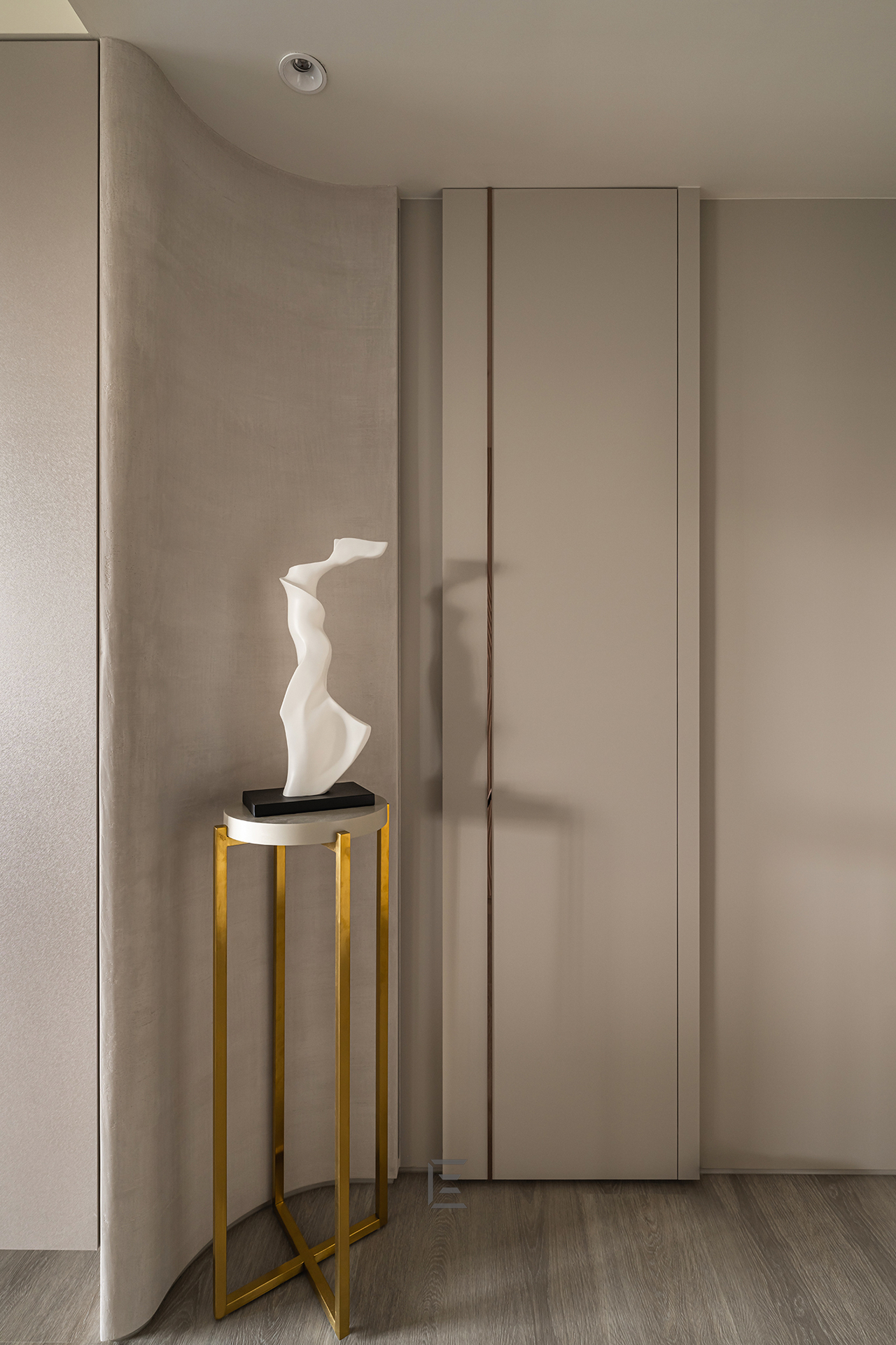 在玄關設計入口處,同樣也重視「實用及收納」。特別做了儲物間,可以讓屋主收納外出衣物、鞋、帽等各式生活用品。看起來簡單的玄關設計,其實只要在適當的空間不影響動線的情況下,加上簡約的端景几以及收藏品,立刻可以展現屋主對於細節的品味。