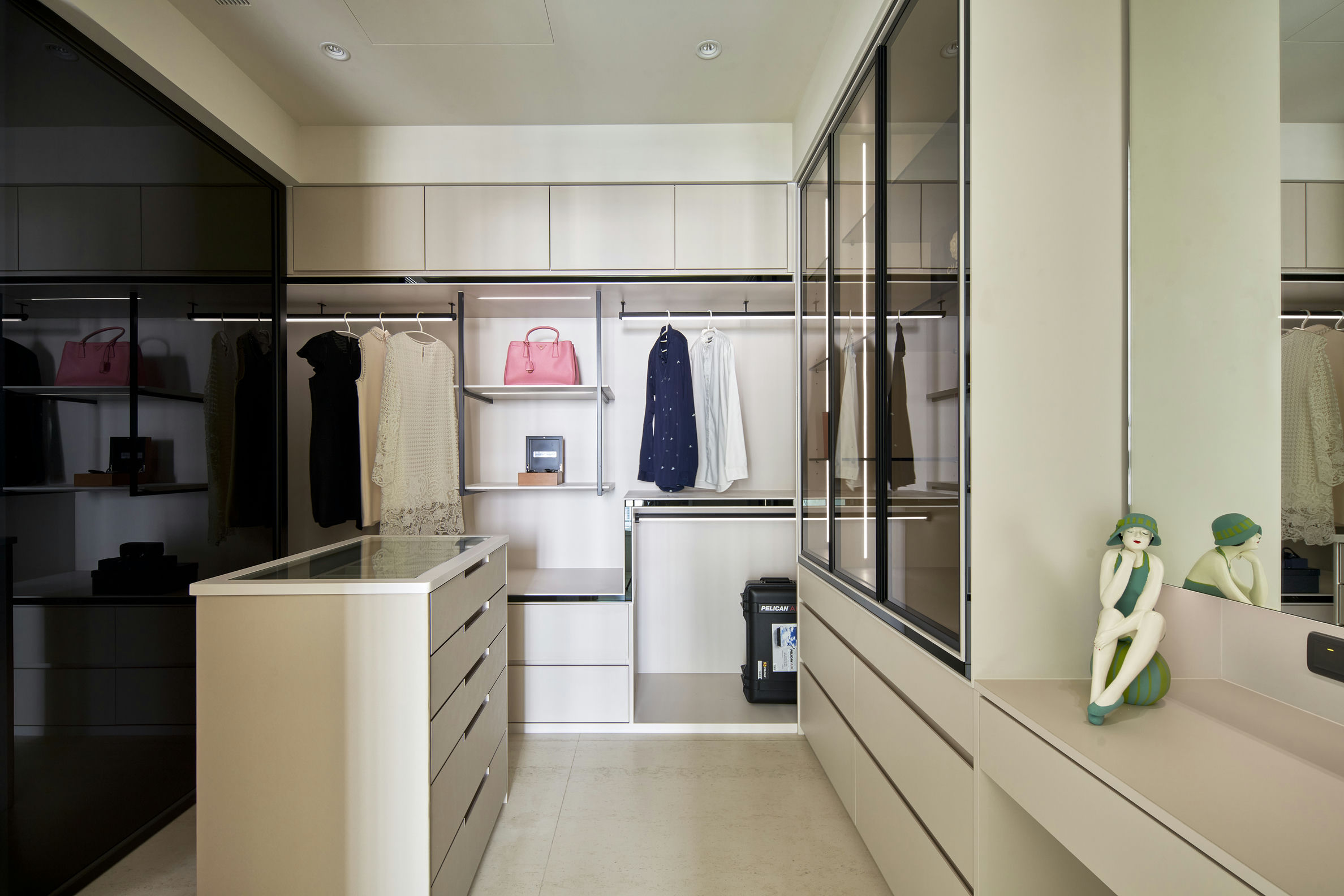 此案例空間寬敞,中央設計中島展示櫃體,搭配兩側整面收納區,實現如精品店般的收納體驗。抽屜結合玻璃檯面可一眼看見配件、領帶或墨鏡等物品。