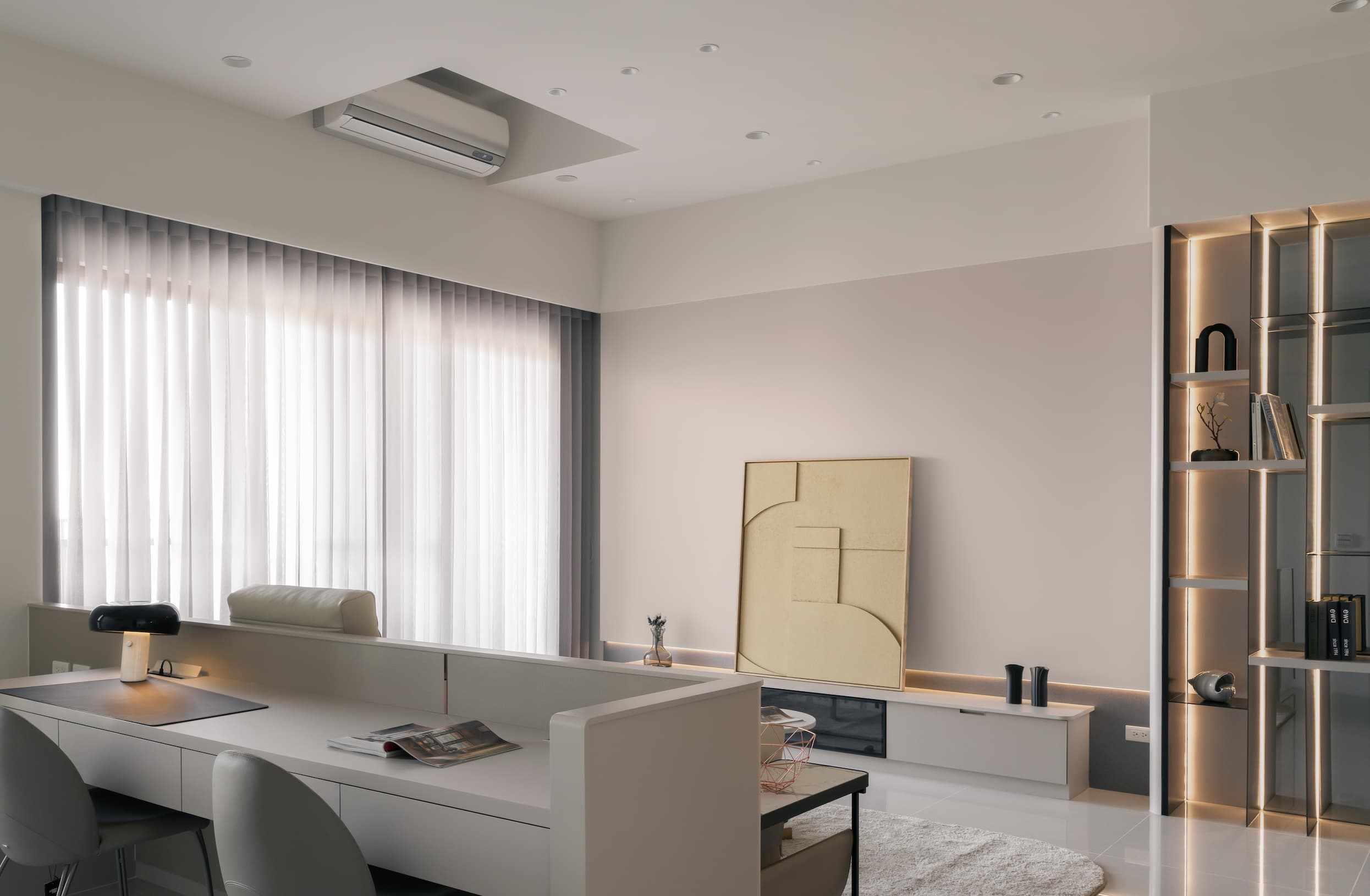 當客廳與後方書房共存於同一軸線時,簡約設計的重點在於「界線清楚、視覺連續」。以統一色系與材質延伸兩個空間的背景,或用透明玻璃、半矮隔屏等「輕盈隔間」的效果,能讓客廳與書房(或其它多功能空間)自然串接,而不會彼此干擾。當功能區域被巧妙分工、視覺維持乾淨留白時,即使是複合空間,也能兼具簡約的美感與實用性。