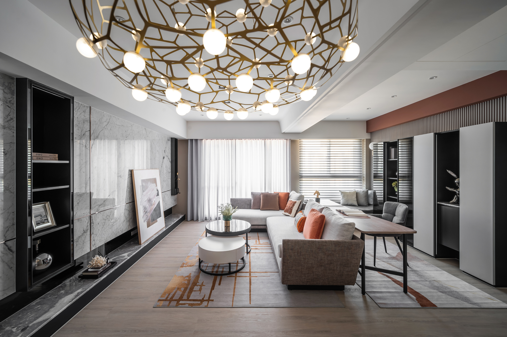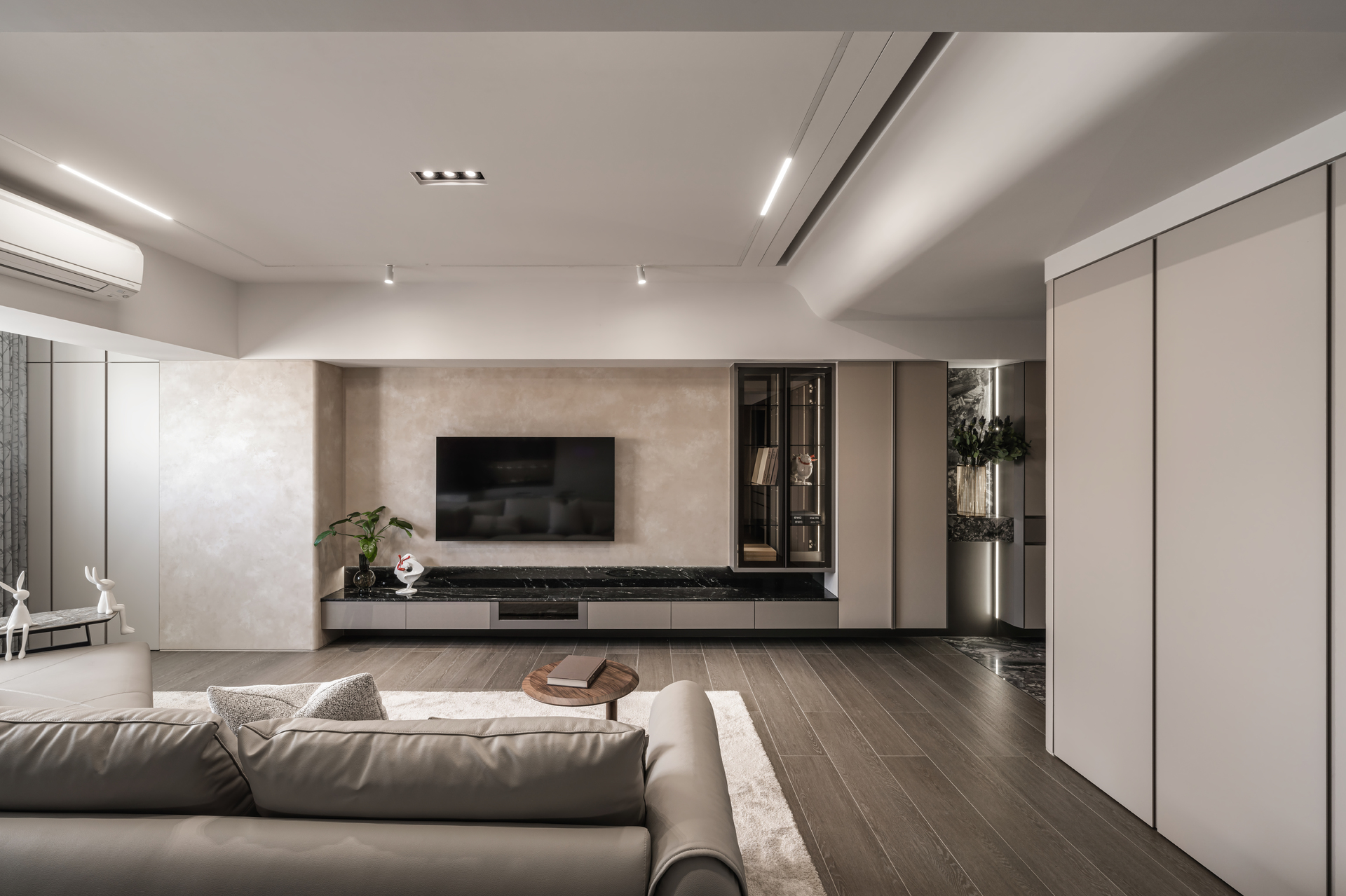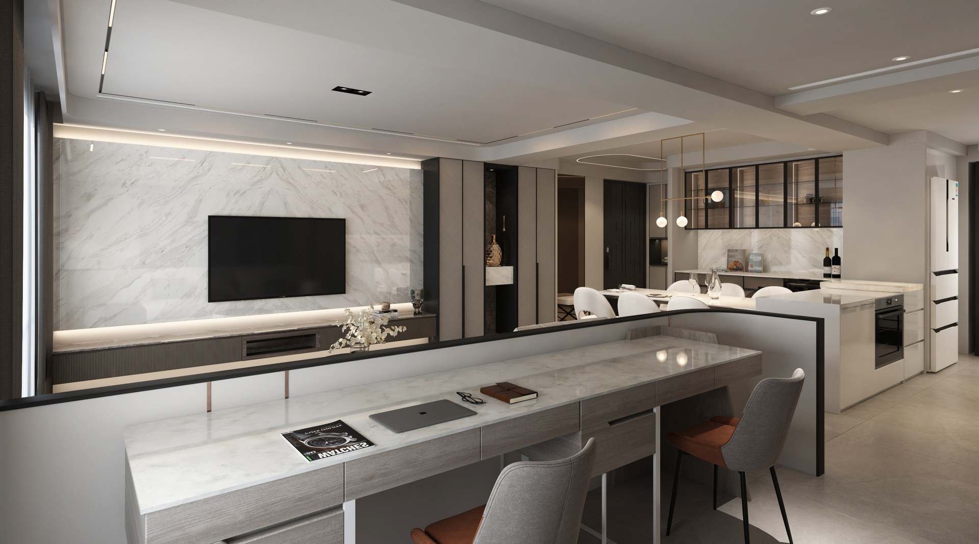 國王傳奇1作品由⽑胚屋開始從零打造,在客廳設計運⽤了⽯紋、⽪⾰、鈦⾦以及圓弧曲線的天花板打造極精緻的豪宅客廳質感。整體沒有嬌奢之氣,只有內斂貴族⾃然散發的輕奢美學。