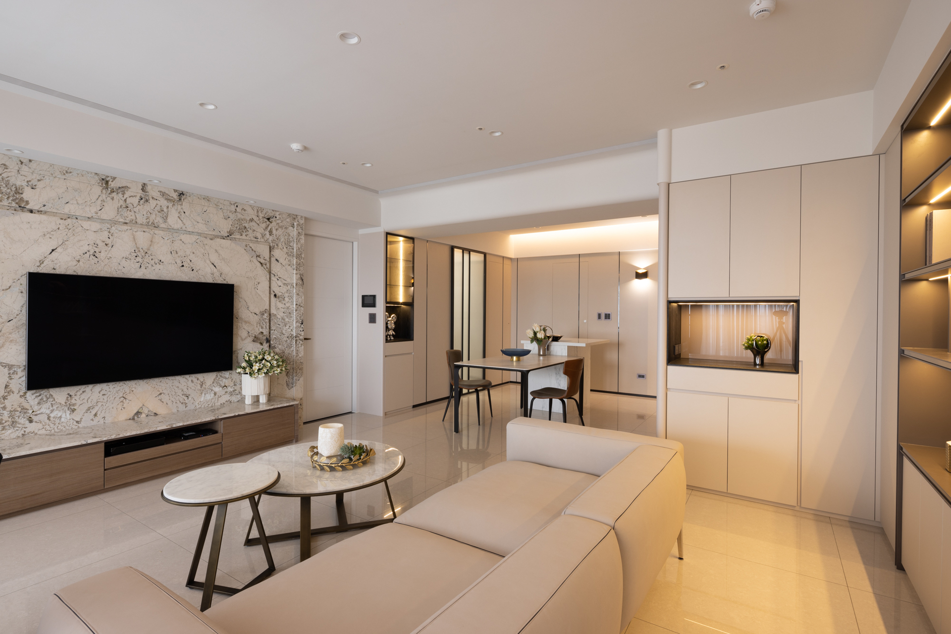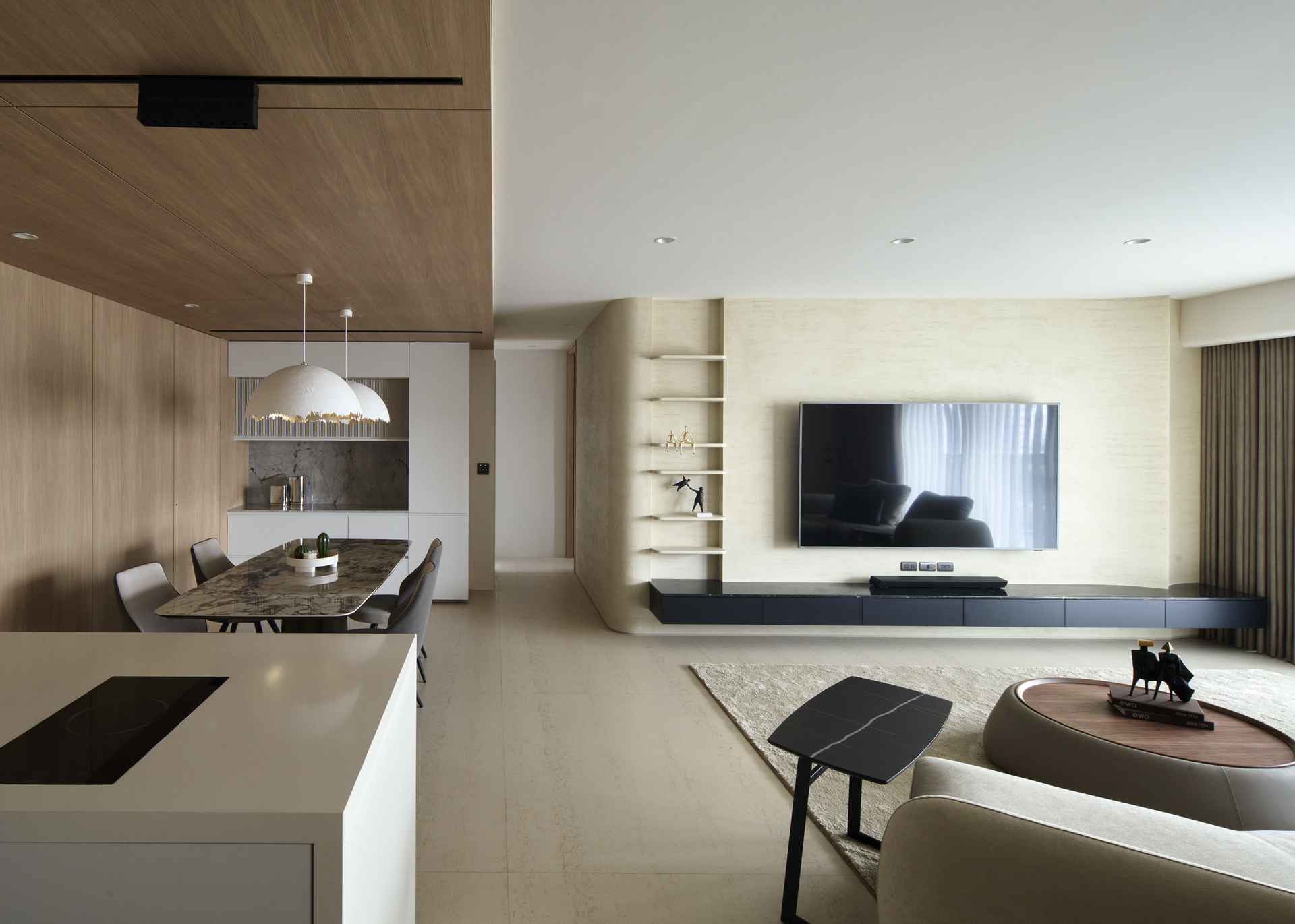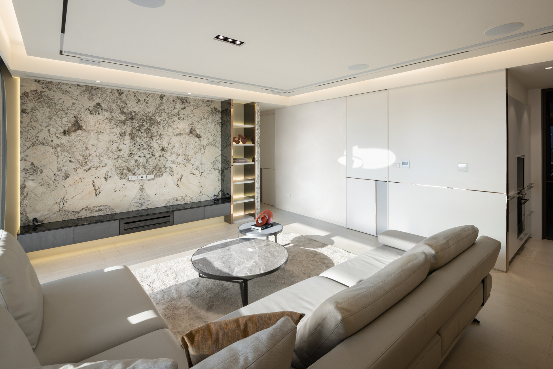 定潮 11F 作品,在天花板的設計也以圓曲度加以修飾,溫潤感及客廳使⽤的舒適感都加分不少。簡單的配⾊以及反向思考以部份⽯材點綴的沙發背牆,帶來的不只是⼈⼈愛的現代簡約⾵,更是直上輕奢美學設計的頂點。