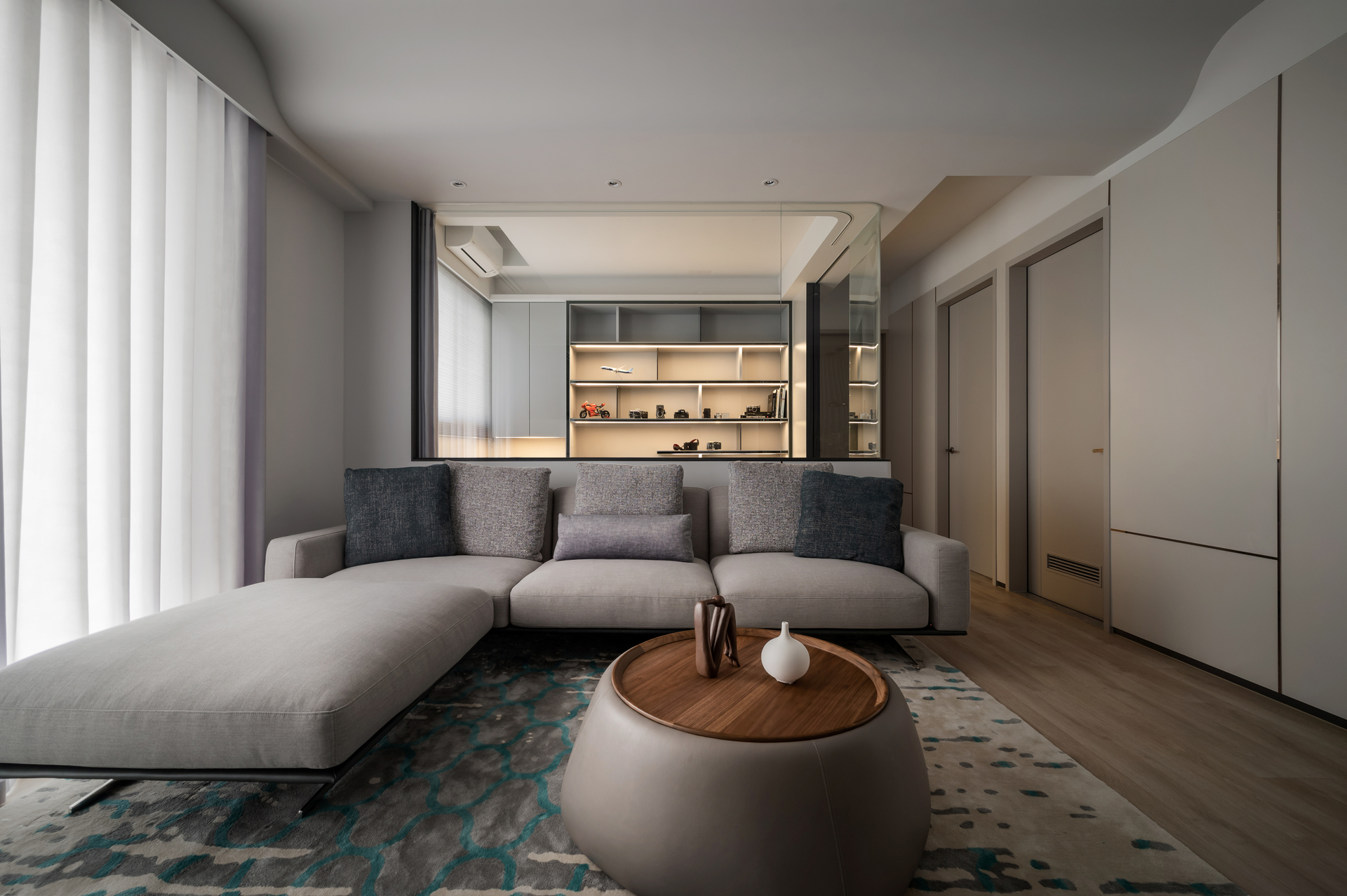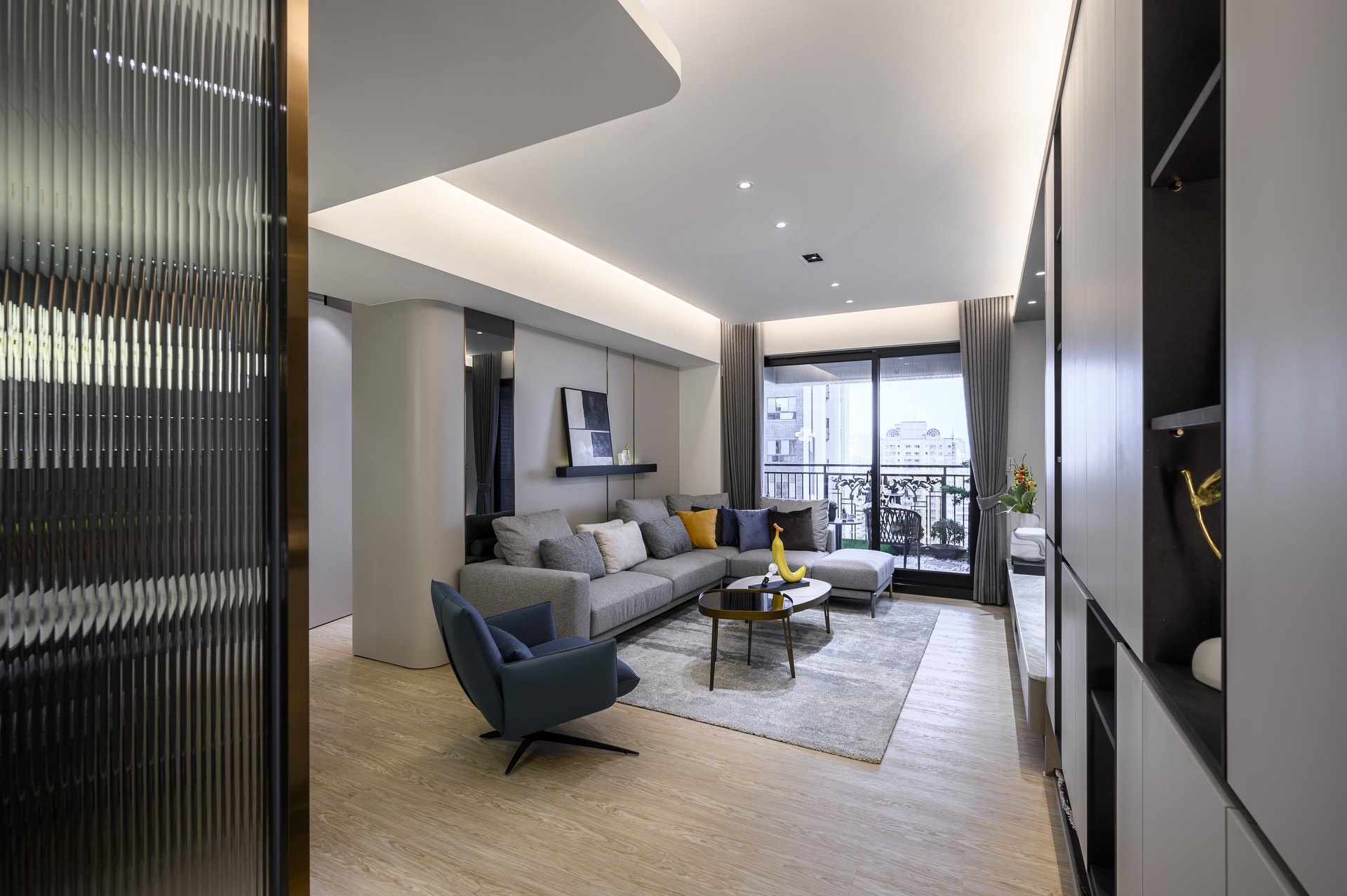御廳苑的整體設計不在特別出眾的配⾊,⽽是在有限的空間中運⽤多個材質營造現代簡約⾵格客廳的多⾯貌。除了素灰的牆⾯,也同時在客廳設計中運⽤了⾦屬玻璃、全室⽊紋地板、微跳⾊軟裝。這些看似不同的材質與毫不相干的⾊系,讓客廳的簡約⾵格帶幾分俏⽪活潑。