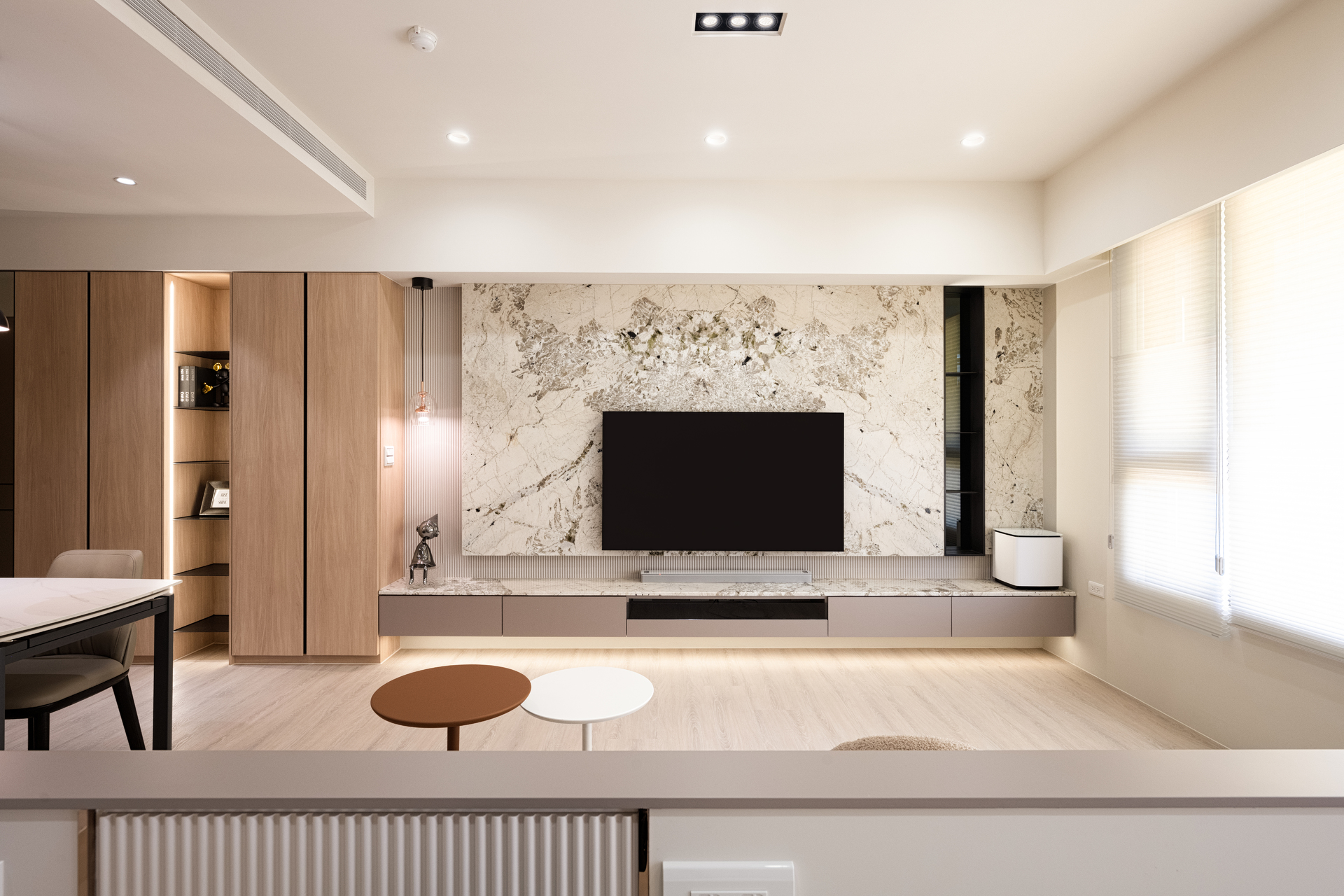 美術君御也是客廳現代⾵裝潢的代表,除了做到簡約美感,實⽤主義也在這裡完整展現。沒有太多複雜的造型,簡約的⽶⾊+褐⾊跳⾊搭配異材質⽯材的運⽤,展現⼩宅的簡約之美。系統櫃與⽊作的交替運⽤,無違和的存在客、餐廳每⼀處空間,讓收納與展⽰完美融合。